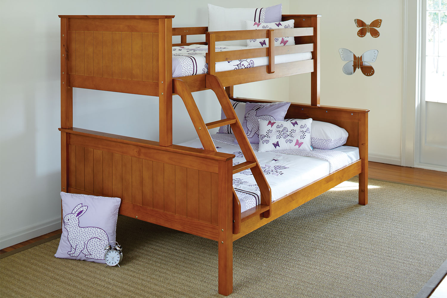 The Selena Duo Bunk Bed Frame by Nero Furniture is the perfect solution for sleepovers or when space is limited in a shared bedroom. Made from solid NZ Pine, this bed frame is made to stand the test of time. Contains an easy to climb ladder on the side and provides the added convenience of a double bed, The top bunk is railed for safety. This timeless bunk bed can also be converted into two free standing beds.