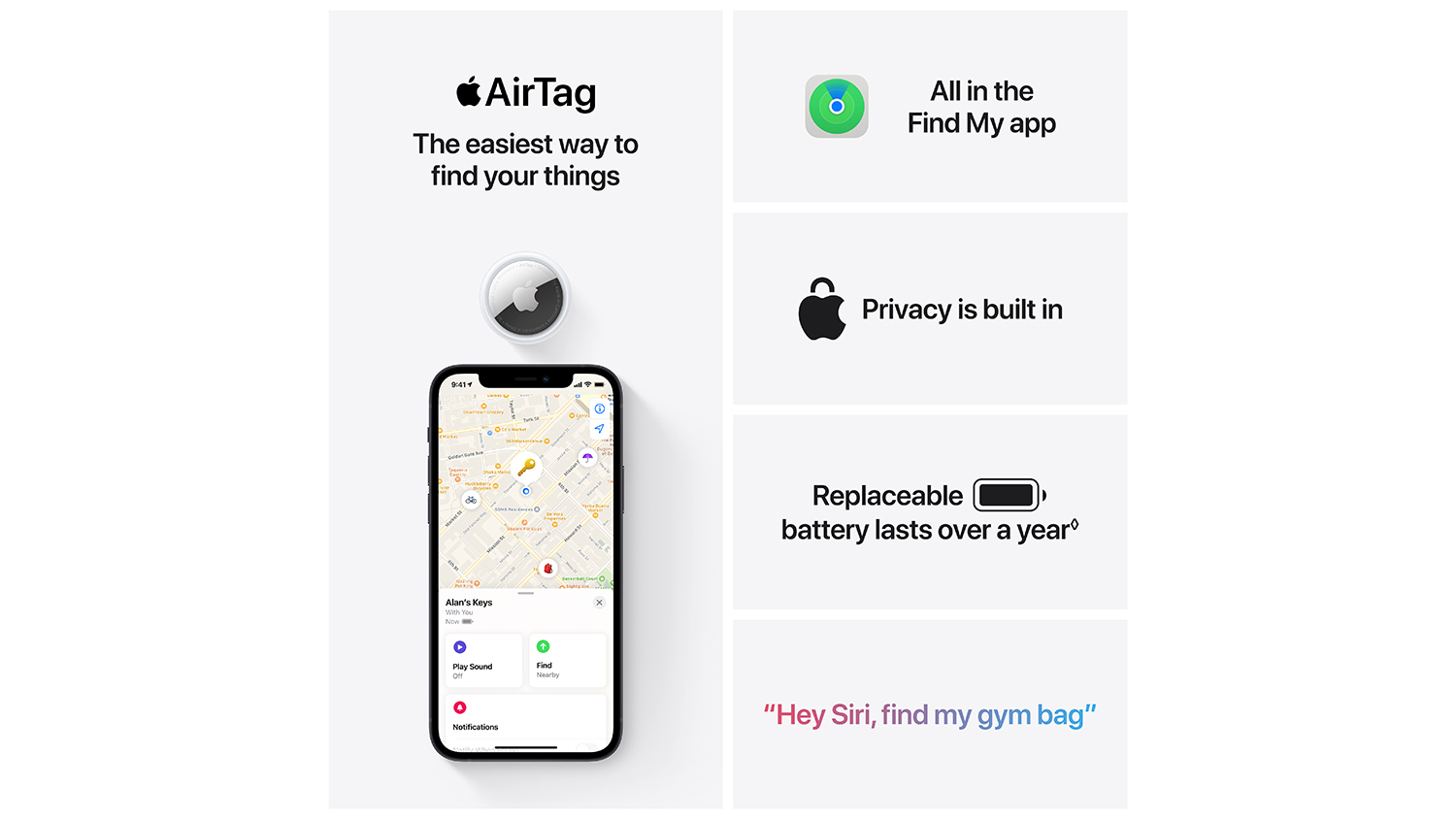 AirTag. Keep track of your keys, wallet, luggage, backpack and more, all in the Find My app. Play a sound on the built-in speaker to help find your AirTag nearby. Or if it’s further away, get help from hundreds of millions of Apple devices in the Find My network to track it down. All anonymously, and encrypted for privacy.