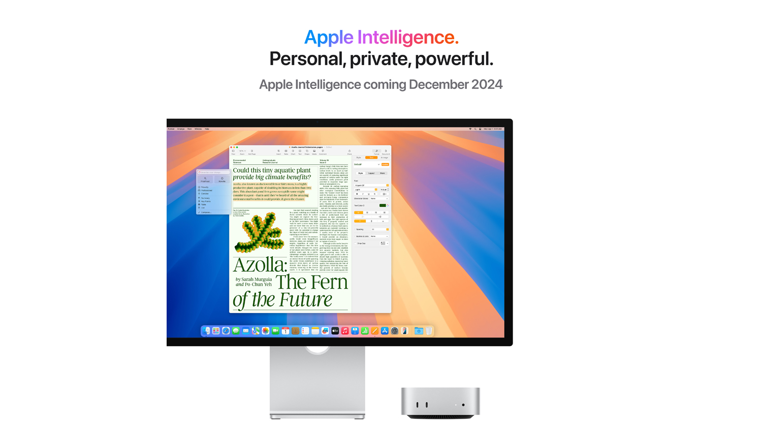 1Apple Intelligence is available in beta on all Mac models with M1 and later, with Siri and device language set to US English, as a macOS Sequoia update. English (Australia, Canada, Ireland, New Zealand, South Africa, UK) language support available December 2024. Some features and support for additional languages, like Chinese, English (India, Singapore), French, German, Italian, Japanese, Korean, Portuguese, Spanish, Vietnamese and others, will be coming over the course of the next year.