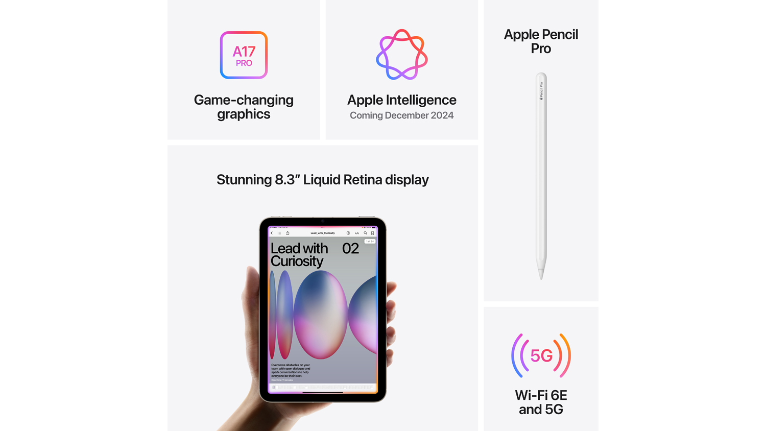 iPad mini. Built for Apple Intelligence.1 It’s incredibly portable and powerful, featuring the ultrafast A17 Pro chip, an 8.3-inch Liquid Retina display2 plus superfast Wi-Fi 6E.3 And it works with Apple Pencil Pro, so you can study, work, play and create from anywhere.