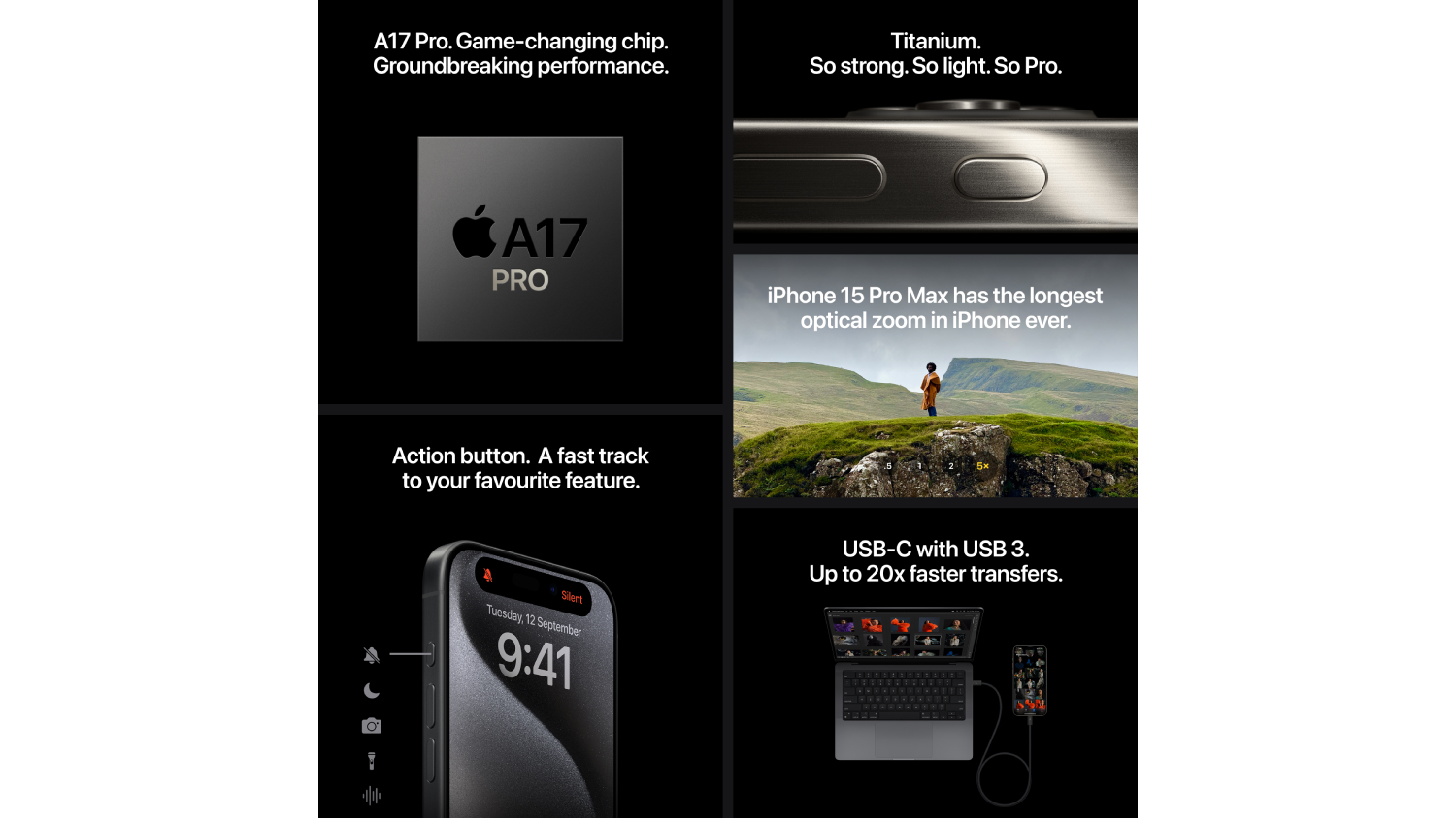 iPhone 15 Pro. Forged in titanium and featuring the groundbreaking A17 Pro chip, a customisable Action button and a more versatile Pro camera system.