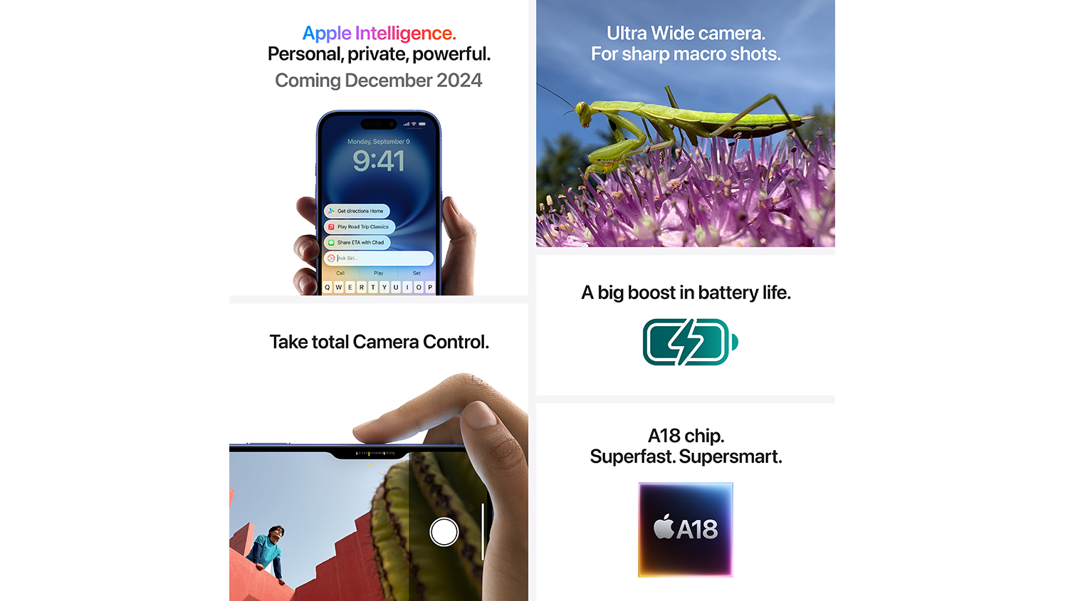 1Apple Intelligence will be available in beta on all iPhone 16 models, iPhone 15 Pro and iPhone 15 Pro Max, with Siri and device language set to US English, as an iOS 18 update in October 2024. New Zealand English support available December 2024. Some features and additional languages will be coming over the course of the next year.
