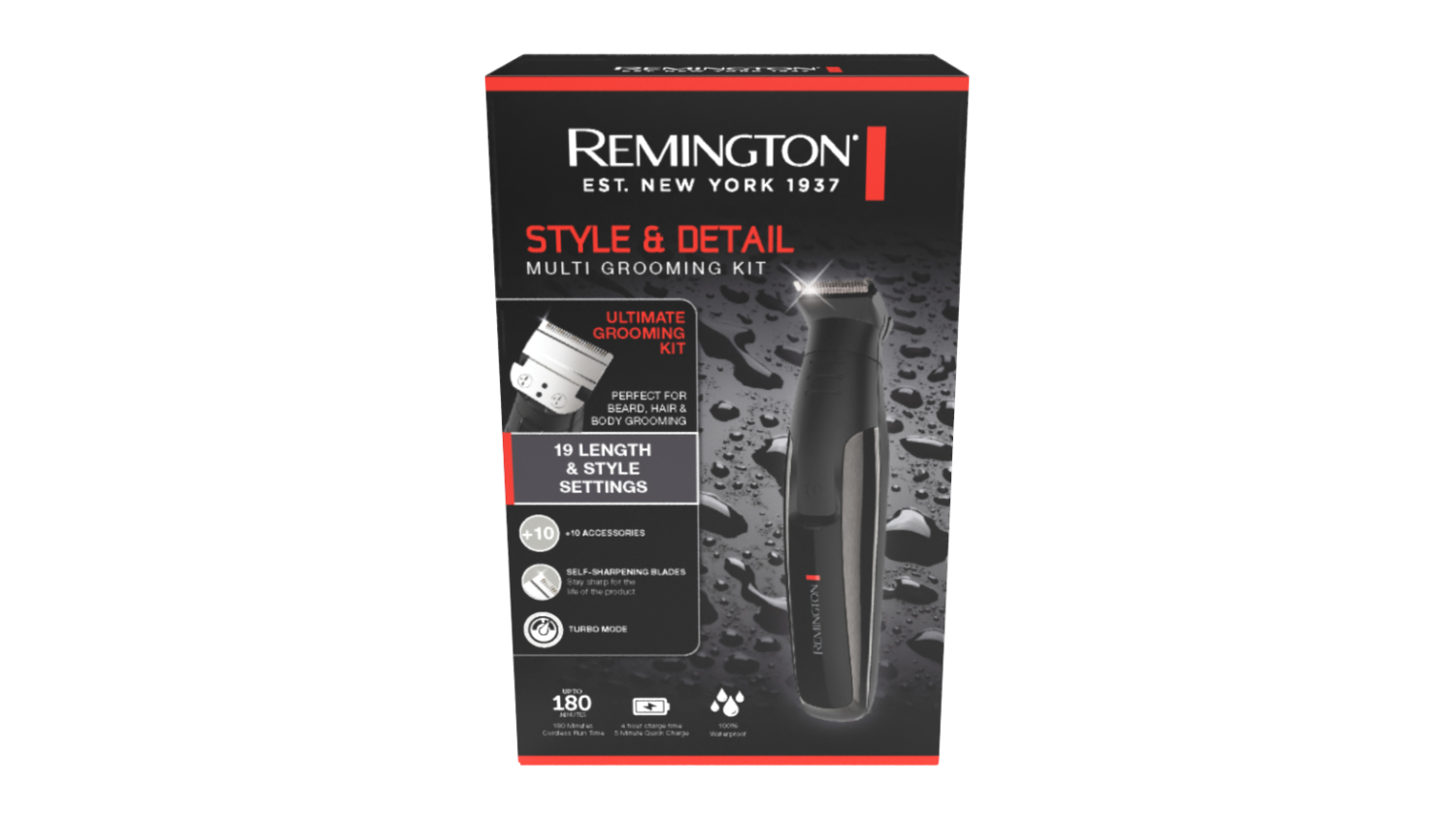 Have total control of your look with the Remington Style and Detail Wet & Dry Cordless Multi Grooming Kit. This intuitive set features a full-sized trimmer, a mini foil shaver, an arc detail trimmer, and an NEE trimmer attachment to accommodate different grooming needs. It also offers up to 180 minutes of cordless runtime, allowing you to enjoy months of powerful trimming before the next recharge.