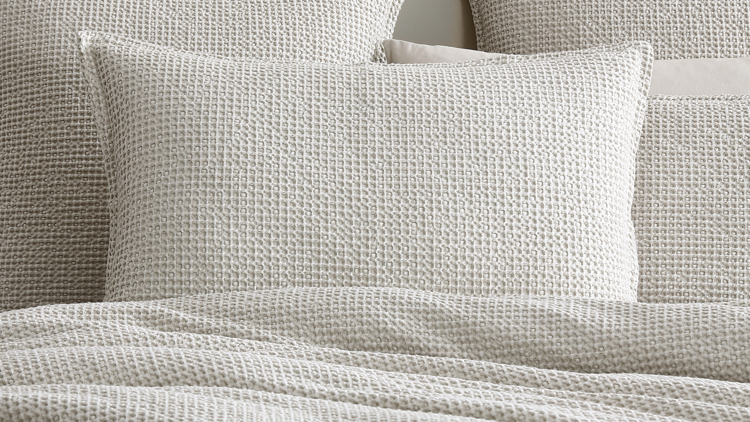 Available in classic stone colour, stonewashed to enhance the waffle texture and 3D effect. The edge is framed with a self-fabric flange.