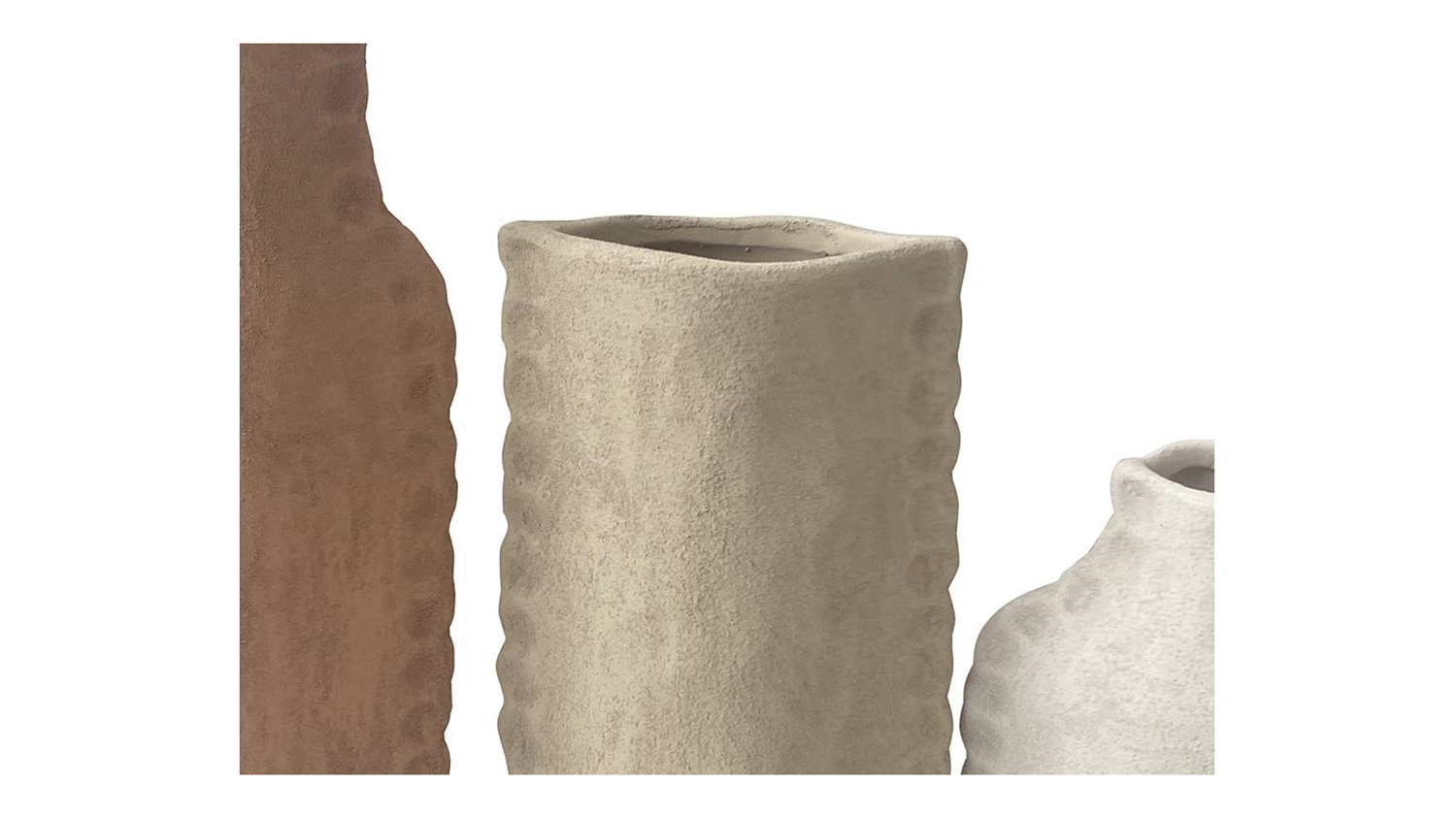 Unveil artisanal beauty with our set of 3 pinched stoneware vases. The set includes three complementary sizes, expertly proportioned to create an instantly balanced and visually interesting display when grouped together as a centerpiece or arranged across different surfaces.