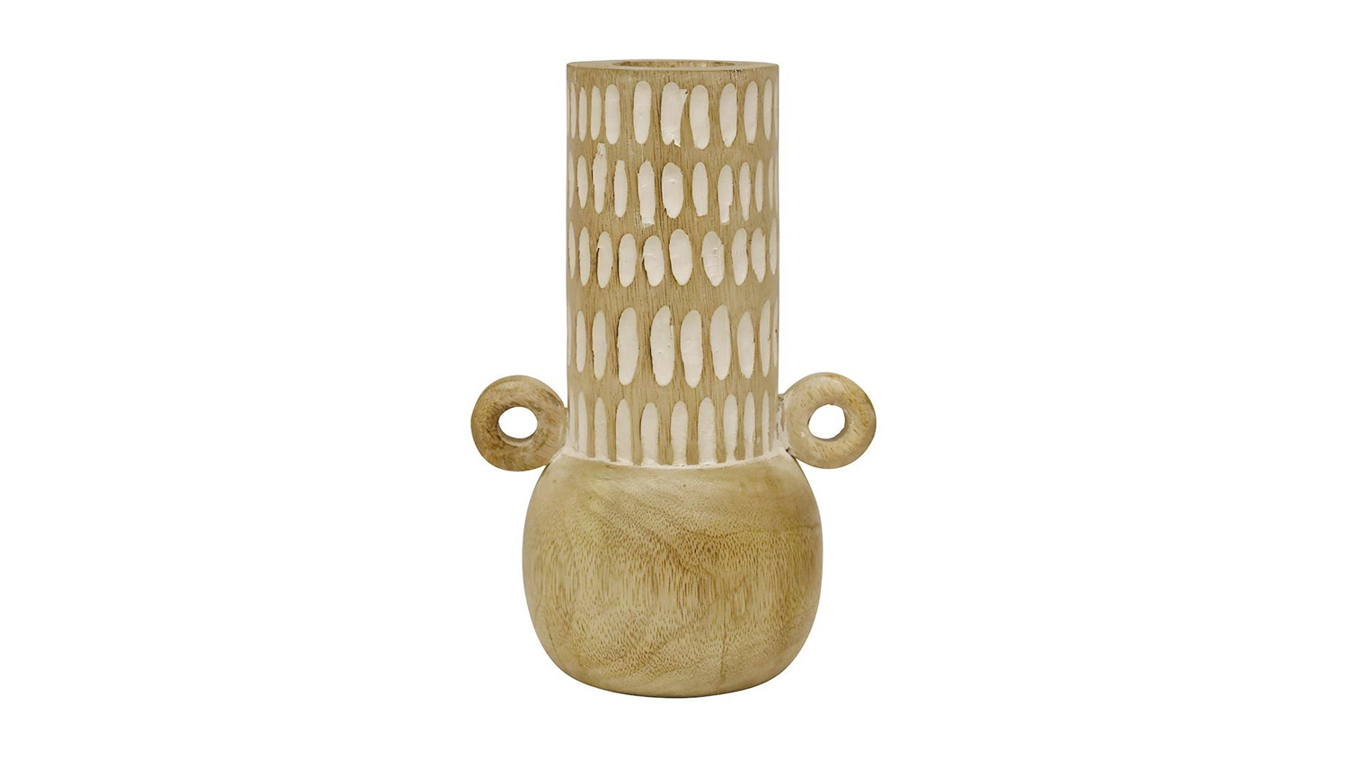Enrich your living space with the Zeltz Carved Wood Vase. Crafted from mango wood with a white wash finish, this piece from Stoneleigh & Roberson adds an artistic touch that seamlessly fuses elegance and nature.