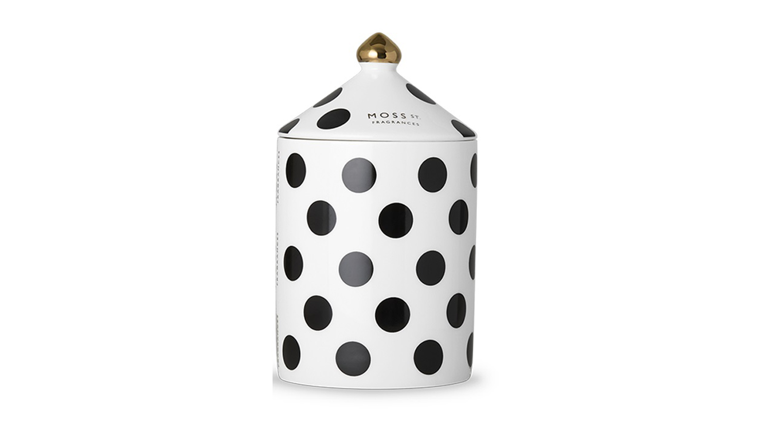 An opulent, mysterious fragrance that embodies the quiet romance of nightfall. Hand-poured in ceramic vessels, wrapped in a black polka-dot print with a matching ceramic lid.