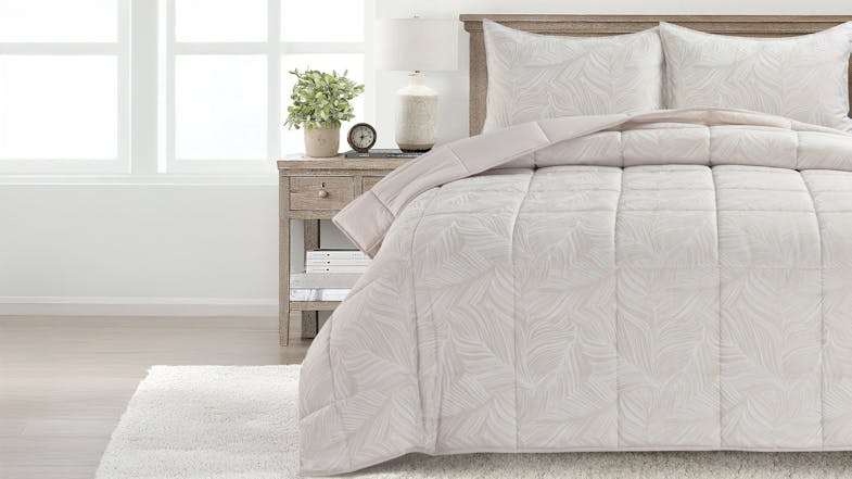 Presenting the Cove Natural3 Piece Comforter Set. Introduce a sense of tranquility to your bedroom with the idyllic palm leaf design. The neutral coloured jacquard weave is the perfect addition to your peaceful haven.