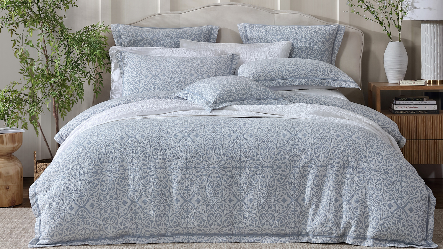 Presenting the Althea European Pillowcase, a beautiful fusion of tradition and modernity. Featuring a classic damask pattern intricately woven in a cotton jacquard, Althea showcases a contemporary colour palette of soft denim blue and crisp white. The addition of a matte herringbone tape, adds a refined touch, enhancing the overall elegance and sophistication of this timeless piece. Perfect for those seeking to elevate their bedroom decor with a blend of classic charm and modern style.