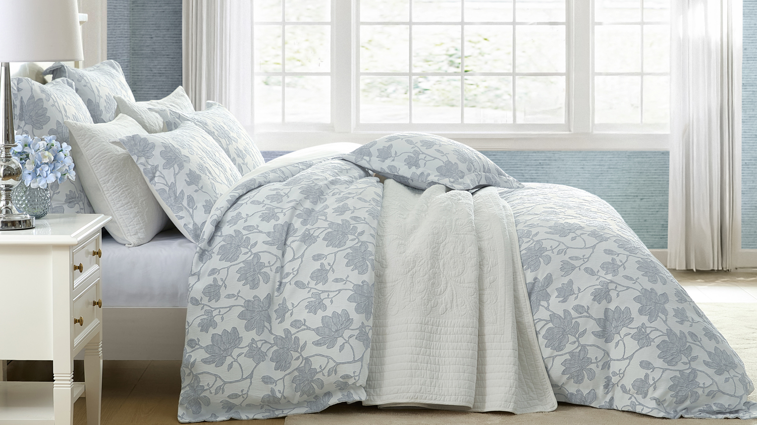 Presenting Bloom, featuring a refreshing denim blue hue. Modern floral trails gracefully climb the bed, showcasing rich texture against the soft ivory base cloth. The simple tailored edge adds a refined finish, creating a beautiful, timeless design. Perfect for those seeking a modern yet elegant touch to their bedroom this season.
