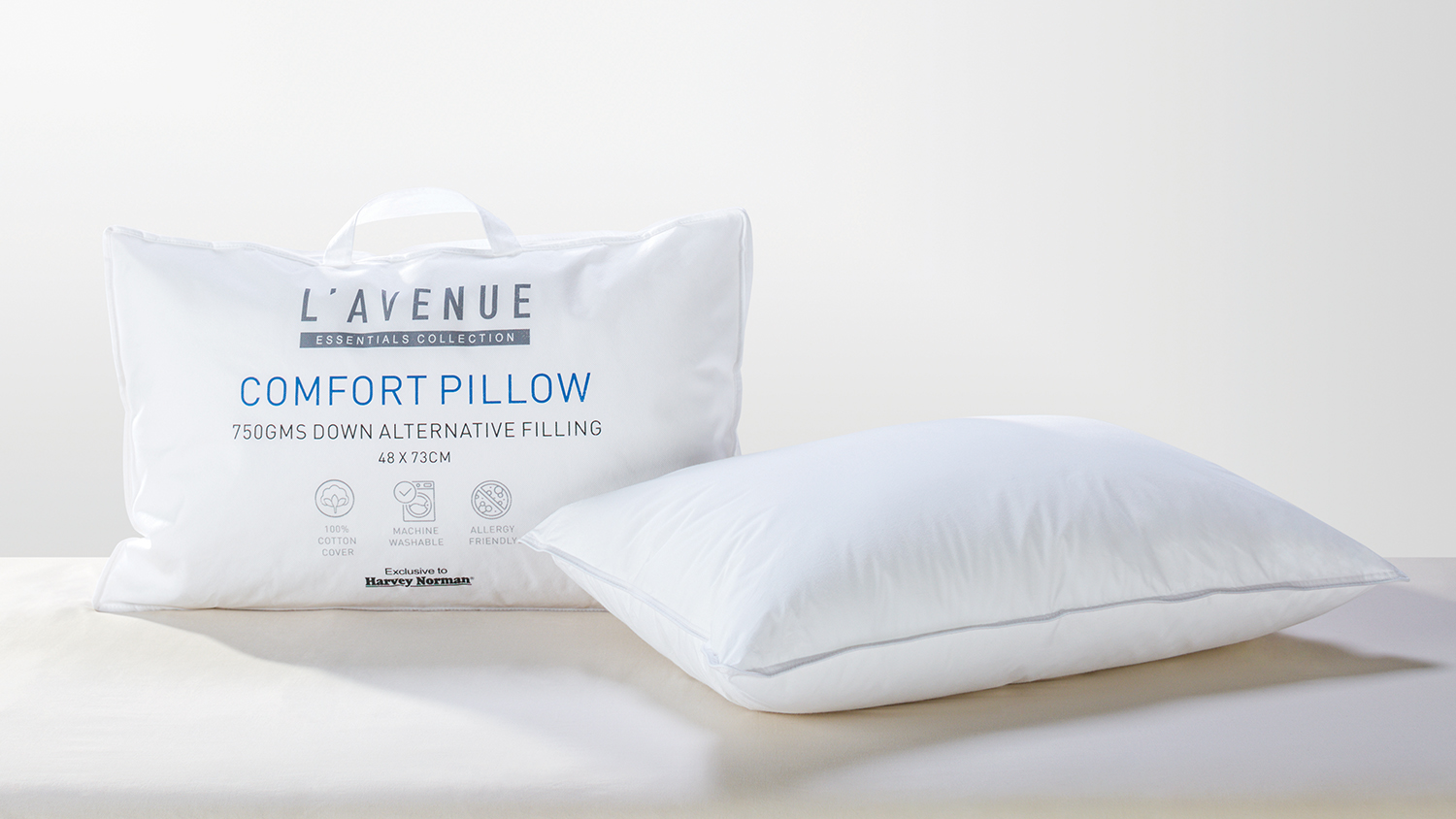 The L'Avenue Essentials Comfort Pillow is a standard size 750gm pillow, boasting a medium profile and comfort level. Crafted with a 100% pure cotton cover and a soft, allergy-friendly, down-like fill, this pillow offers exceptional sink-in comfort and optimal support.