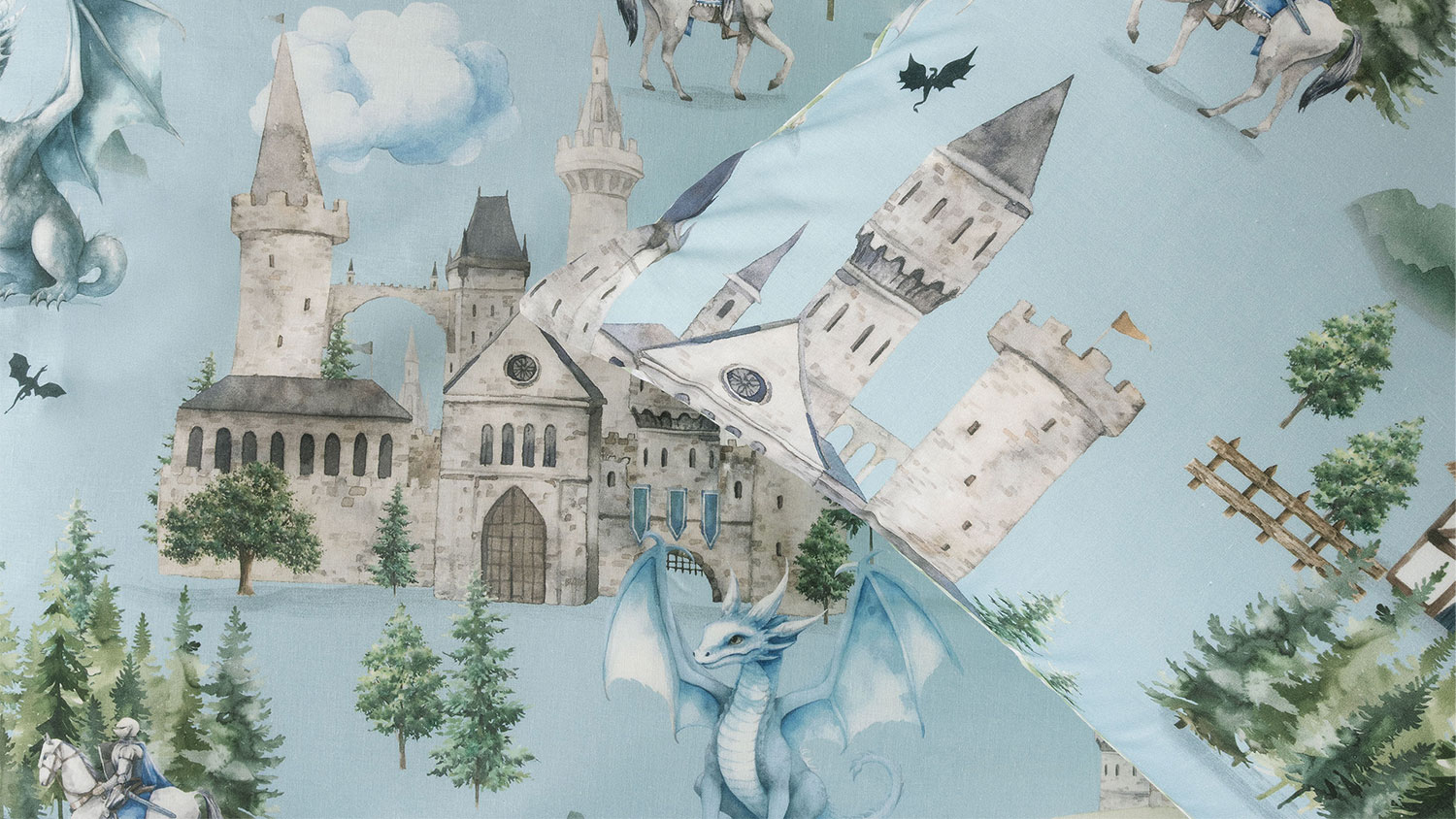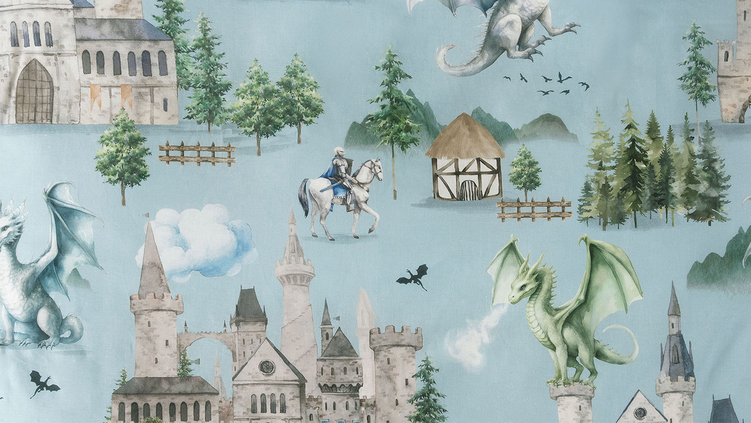Soar into a land of legends with Dragon Dreams! From towering castles and enchanted forests to brave knights and fierce fire-breathers, this duvet cover is bursting with magical tales. Set against a misty blue sky, majestic dragons glide through the clouds while noble steeds gallop below. Printed on 100% cotton, this epic adventure reverses to a sage green check print, the perfect match to the coordinating Charlie Sage sheeting (sold separately).