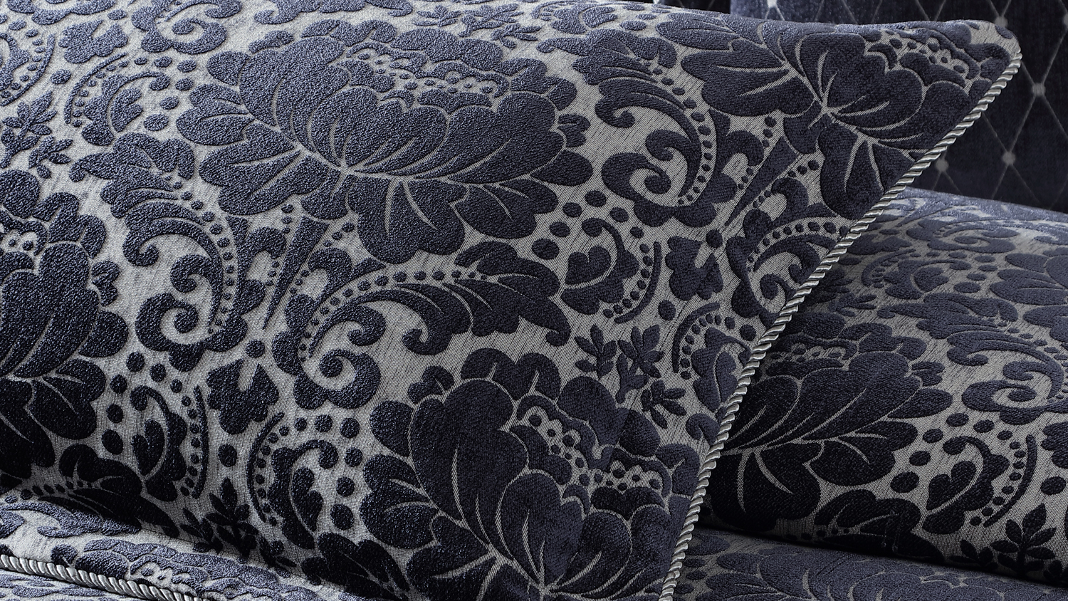 Inspired by vintage wallpaper, Esmeralda showcases an intricate floral damask in classic ink and silver hues. The deluxe chenille yarn adds a luxurious softness, staying true to the elegance of the Da Vinci collection. Finished with silver trimmings, Esmeralda becomes the epitome of sophistication in your bedroom.