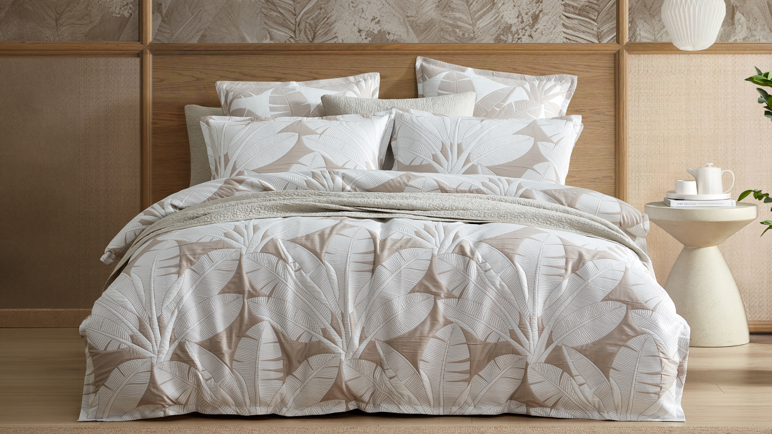 Complete your Lagos setting with the coordinating Euro pillowcase, showcasing the reverse side of the jacquard fabric for a soft layered touch. The textured weave and understated palm detailing bring gentle depth, while the stone palette keeps the look calm, modern, and versatile. Ideal for adding height and a refined finish to your bed styling.
