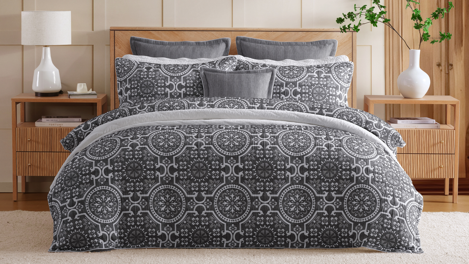 The Mayfair Charcoal cushion showcases the coordinating geometric check, offering a subtle contrast to the dramatic charcoal and white motifs. Its plush feel and tailored finish make it a versatile accent, enhancing the collection’s refined, modern character while adding depth and polished detail to your bed styling.
