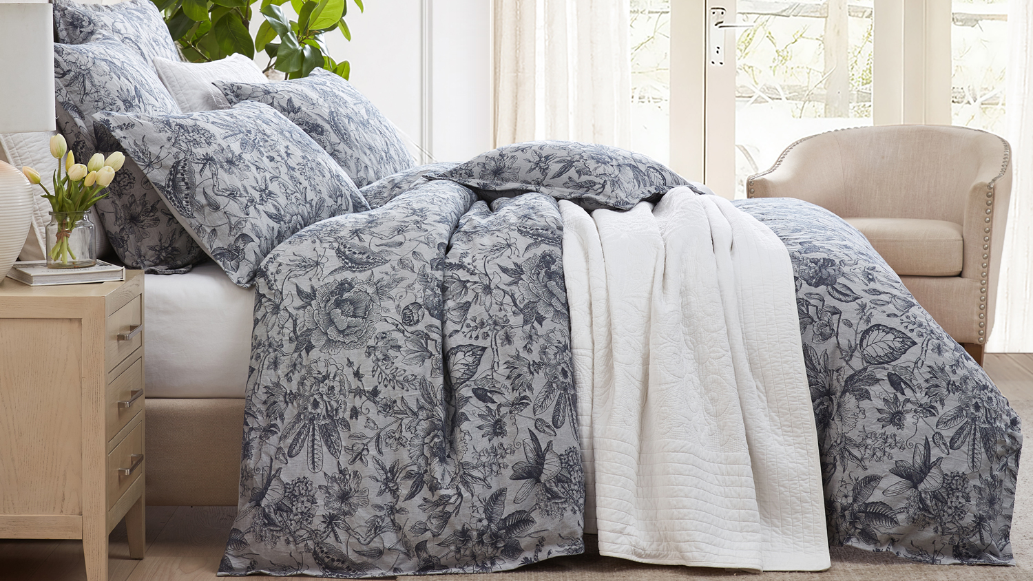 Classic and refined, Paloma Ink features an intricate jacquard floral woven with precision to create depth and dimension. The inky blue tones bring sophistication, while the cotton fabric offers softness, breathability, and enduring quality. With its delicate texture and elegant finish, Paloma is a timeless design that elevates the bedroom with understated luxury and craftsmanship from Private Collection.