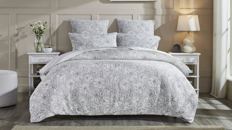 Refresh your bedroom with the delightful Paloma Silver Duvet Cover Set, featuring a charming grey floral design. The 100% cotton printed outer has a soft crinkle effect which enhances the delicate flowers. Transform your bedroom into a peaceful retreat with this beautiful duvet cover set. Pair with the matching European pillowcase to complete the look.