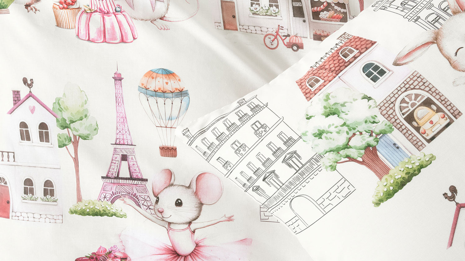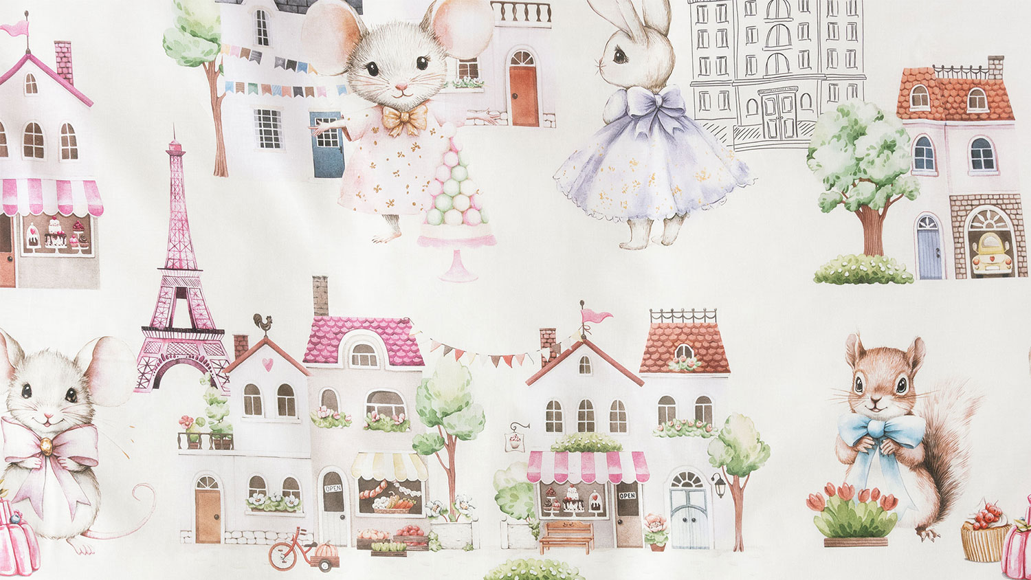 Say bonjour to Paris Tails! Sweet little bunnies, mice and squirrels explore the magic of Paris in style. From fancy dresses and French bakeries to the twinkling Eiffel Tower, this adorable duvet cover is briming with storybook charm. The dreamy Parisian streetscape sits on an off white 100% cotton base and reverses to a blushing pink check print, the perfect match to the coordinating Charlie Blush sheeting (sold separately).