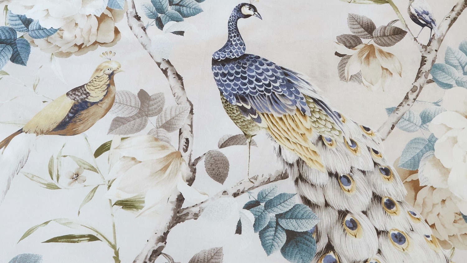 Turn your bedroom into a paradise with our Peacock Duvet Cover Set. Featuring exotic birds on blooming branches, this premium bedding will transport you to a faraway oasis every night. Indulge in luxury and elegance with the softness and beauty of this must-have set. The colours of the Peacock duvet cover sets pattern are achieved through the use of the latest digital technology, printed directly on a 100% cotton fabric with a pattern of more birds and branches in a silver silhouette on the reverse. Featuring concealed buttons on the duvet cover and the pillowcases are finished with an envelope closure.