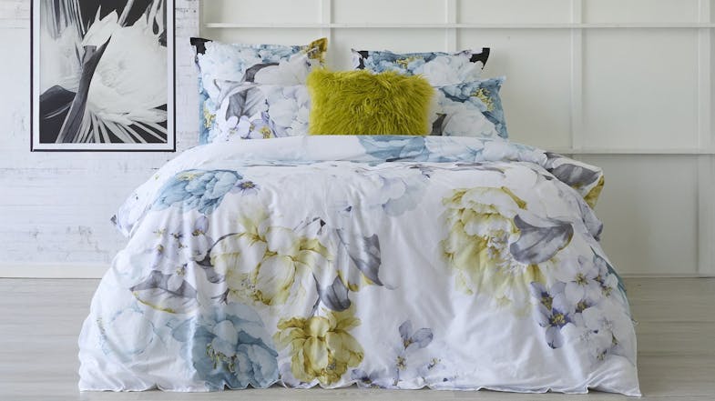 The Peony Duvet Cover Set is ideal for introducing a touch of luxury to your bedroom. Made from 100% cotton, this floral design features opulent peony blooms that transform your bed into an exquisite centrepiece. The understated tones are accentuated with vibrant pops of blue and chartreuse.