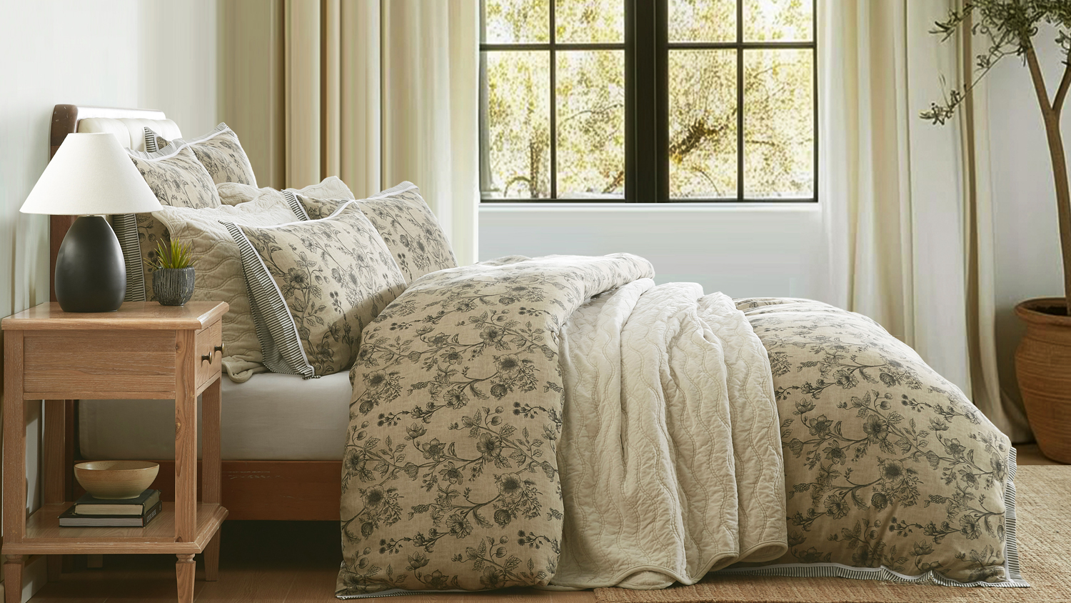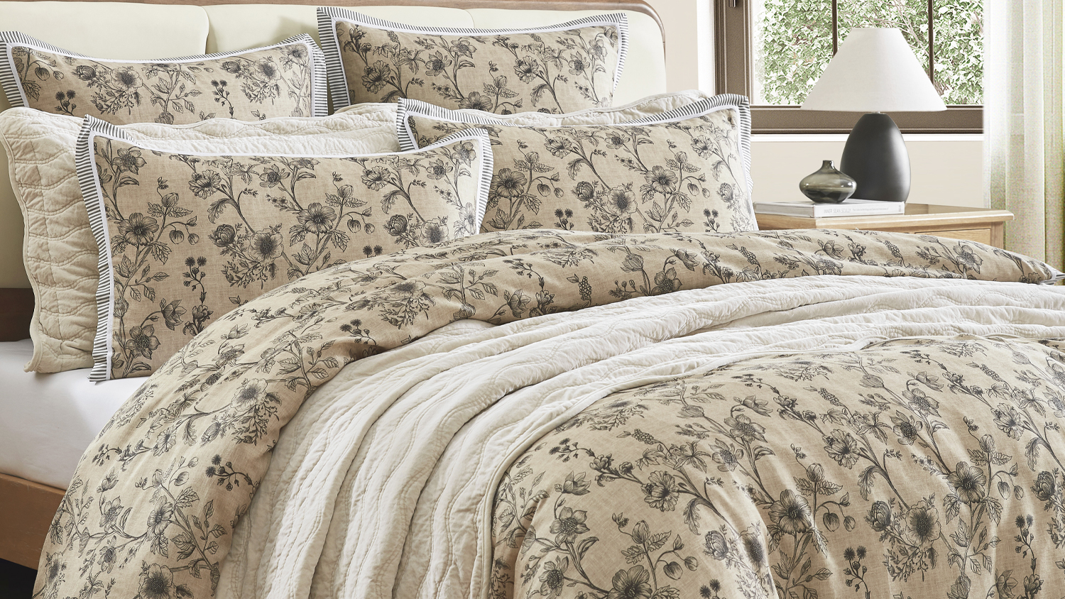 The Perpetua Duvet cover set blends classic elegance with modern flair. Delicate hand-drawn florals on a linen-textured base are framed by a tailored flange edge with pin stripes and a crisp herringbone trim. Its reversible design features a natural and white stripe for versatility, making it a sophisticated statement piece for both timeless and contemporary interiors.