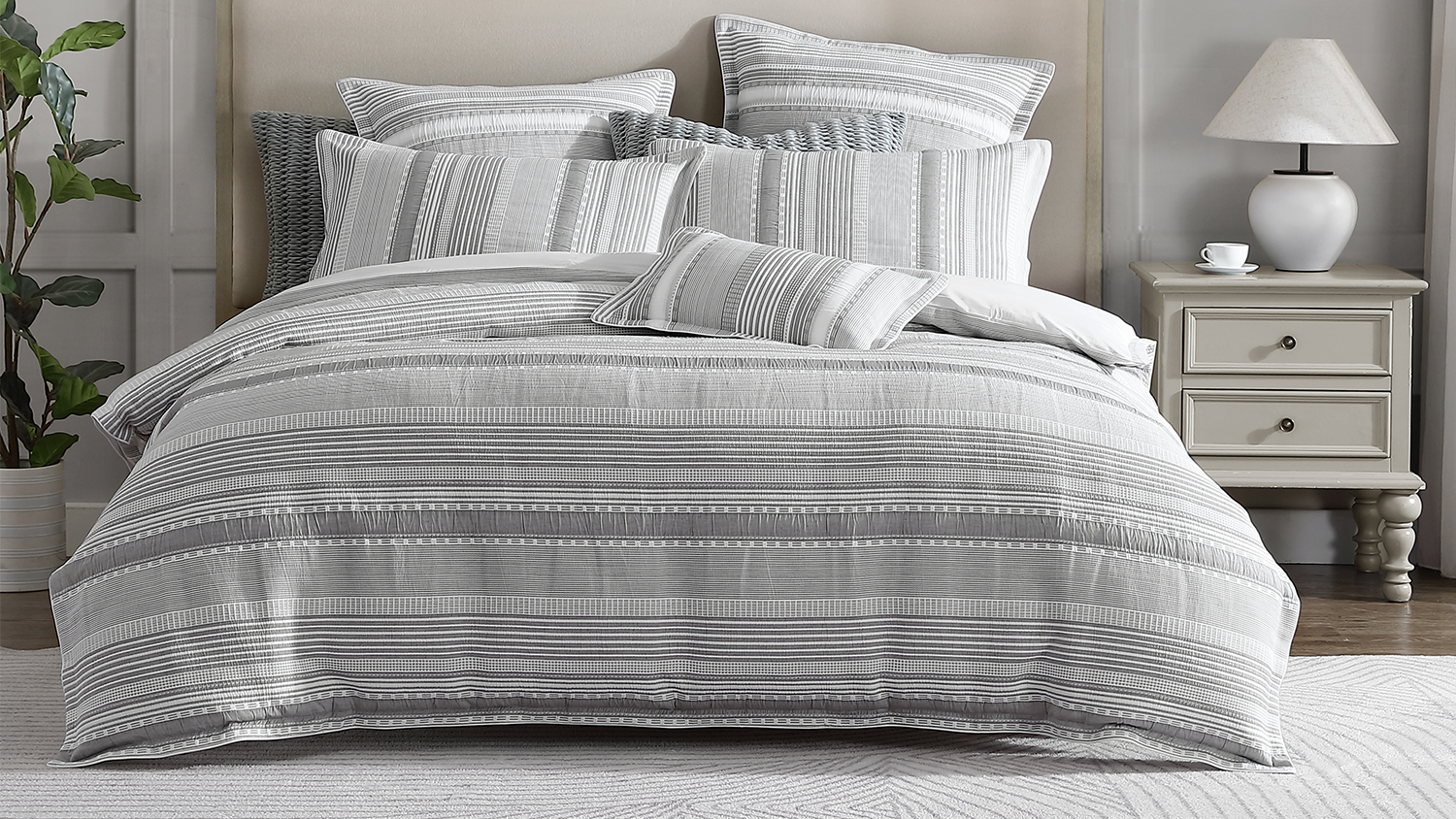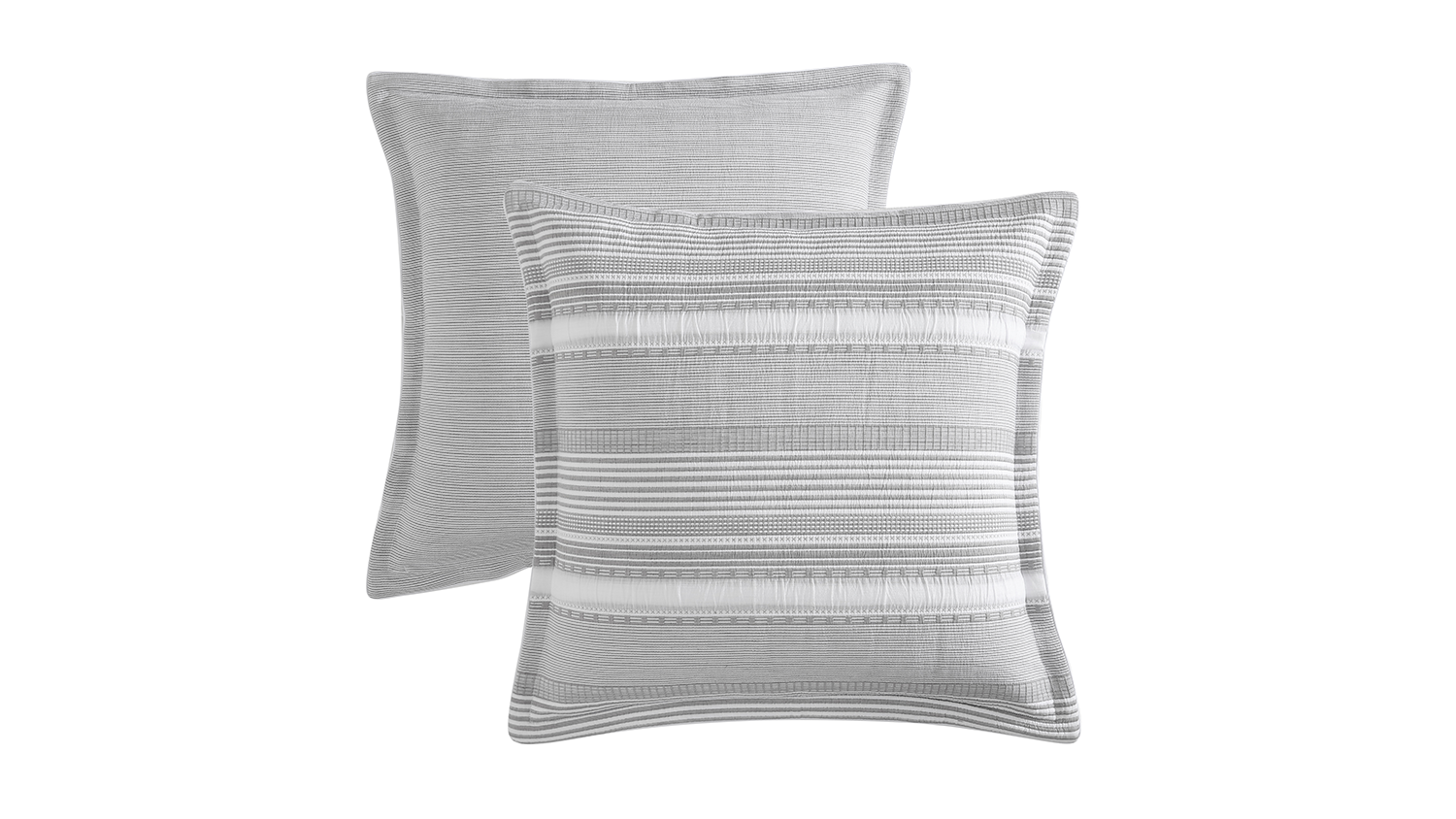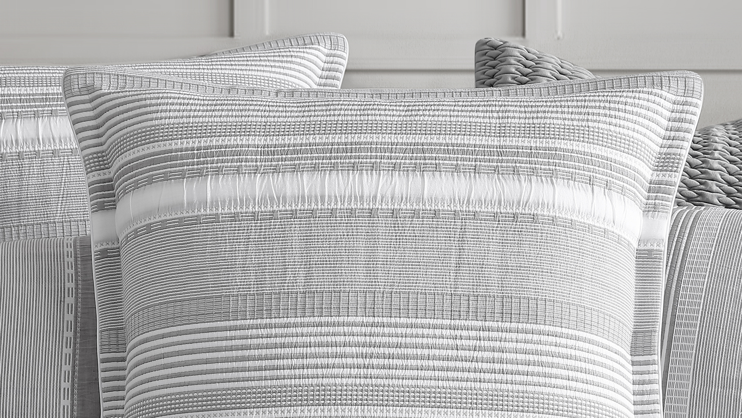 Sinclair Silver combines a modern coastal look with the tactile softness of quilted matelassé. A series of horizontal stripes alternate between plains and patterns balanced by the fresh, tonal palette. Self-flanged and piped edges complete the look.