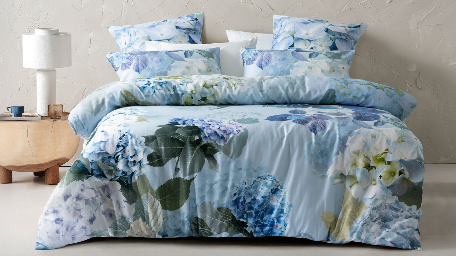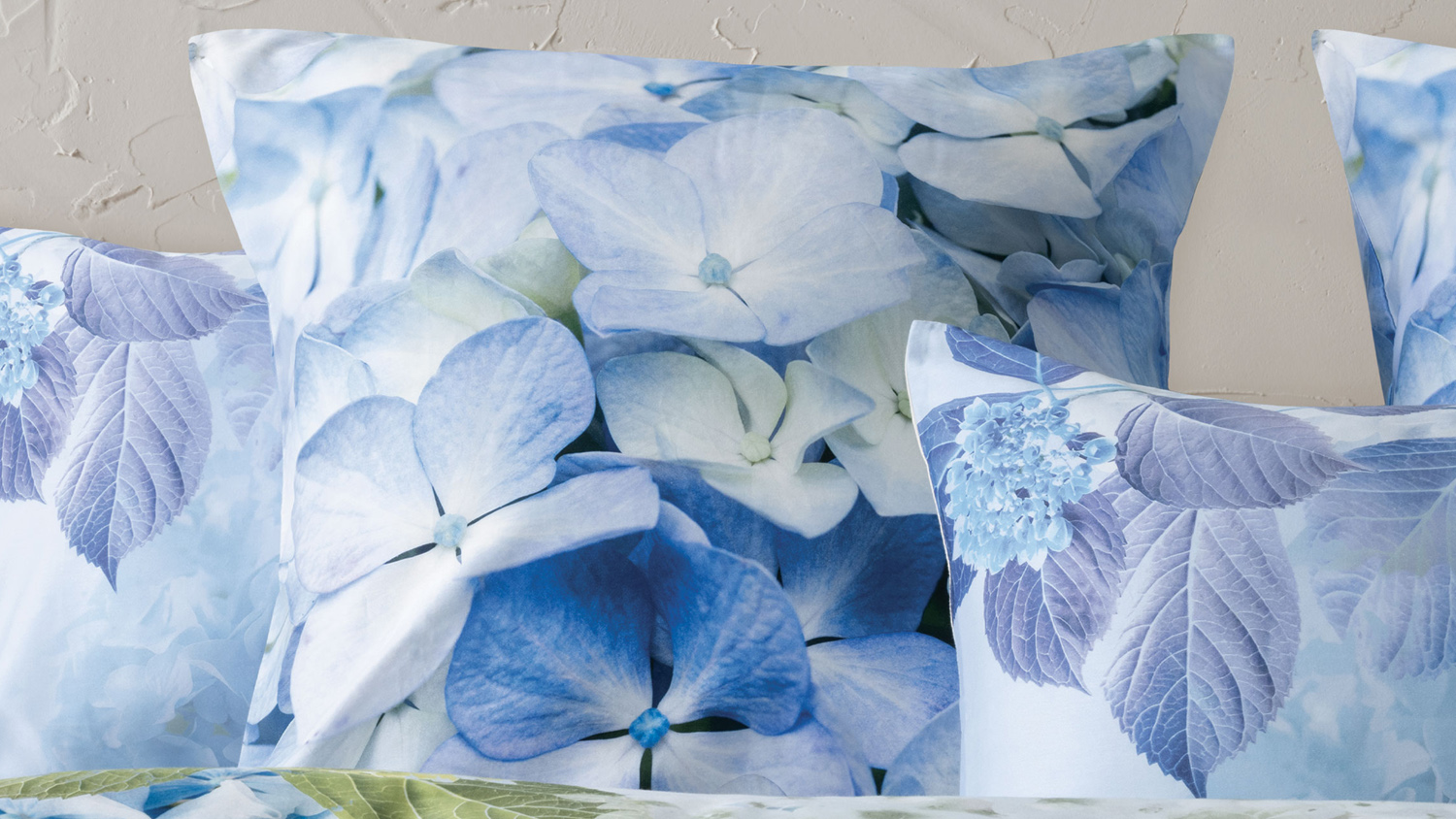 Indulge in the timeless beauty of Thea and allow yourself to be captivated by the enchanting dance of hydrangea blooms. With petals painted in ethereal shades of blue, violet, and white on a cornflower backdrop, Thea will enhance your space with sophisticated elegance. Printed on soft cotton sateen, pair with the matching duvet cover to complete the ambience of your dreamy haven.
