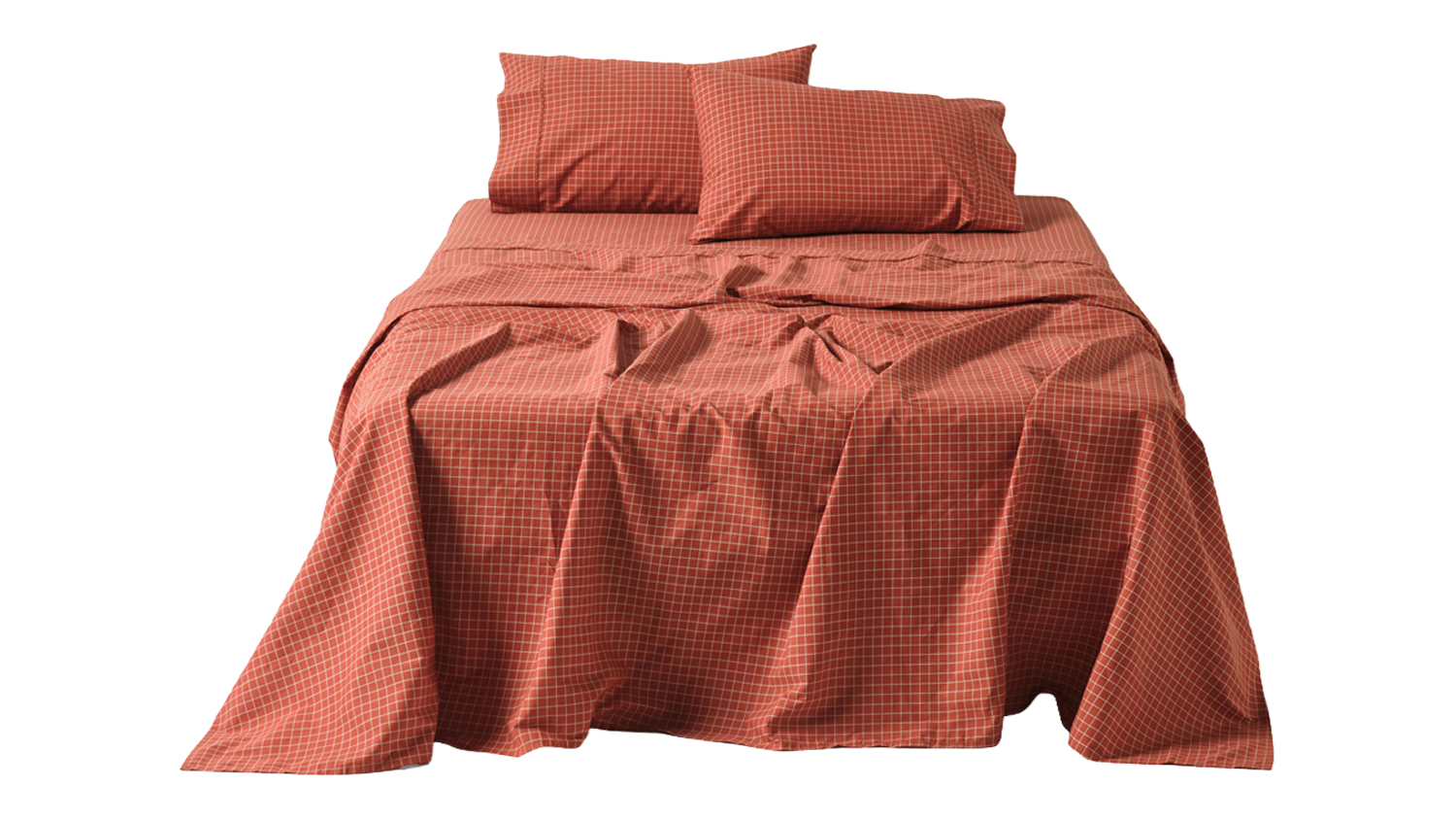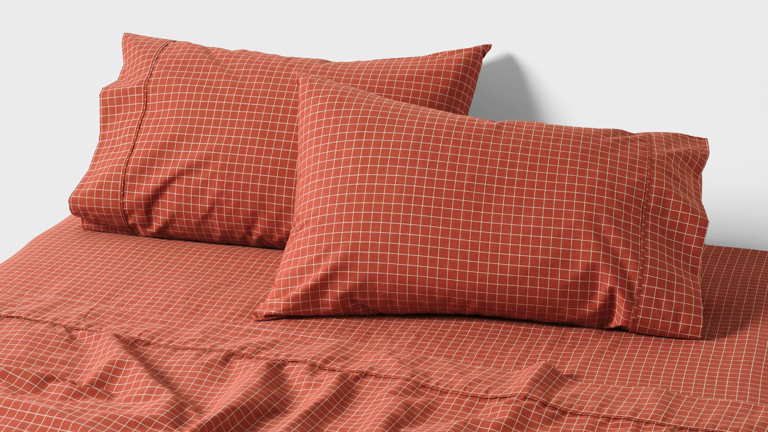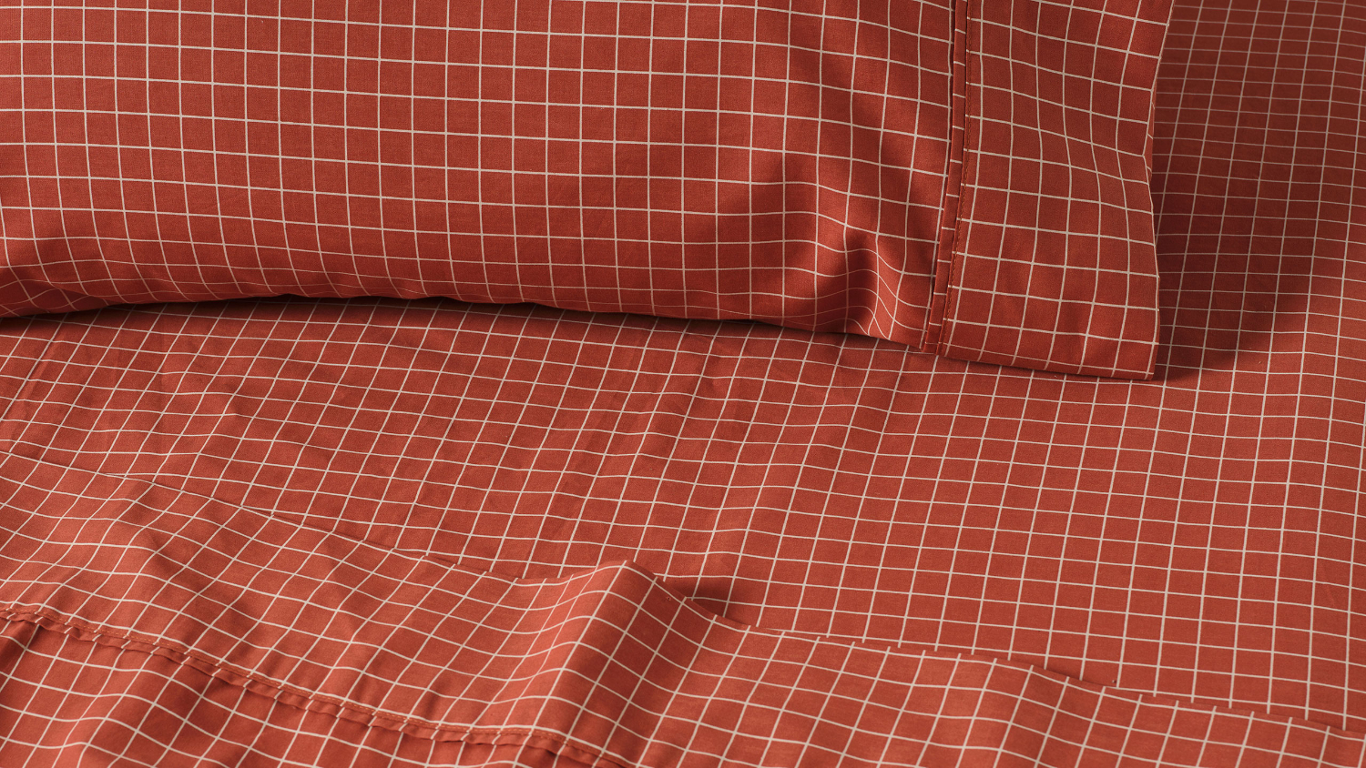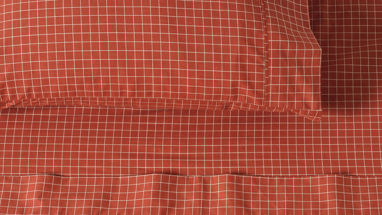 The windowpane check takes on a bolder aesthetic in Volley Check. Designed to elevate any style of interior, the fitted sheet enjoys a 45cm wall while the flat sheet and pillowcases are both cuffed and piped for a dapper finish. This 250 thread cotton percale set is available in Chilli, Chocolate, Orchid and Pebble.