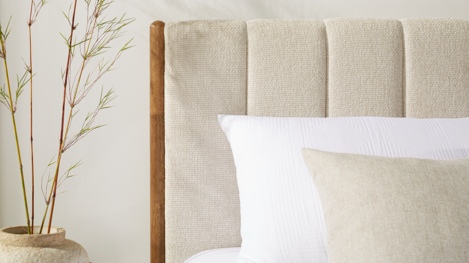 The Benton Bed Frame showcases plush textured fabric upholstery in a classic oatmeal colour. The stunning pleated design of the headboard is sure to add a touch of sophistication to any bedroom. The solid walnut stained legs are beautifully rounded for a soft finish.