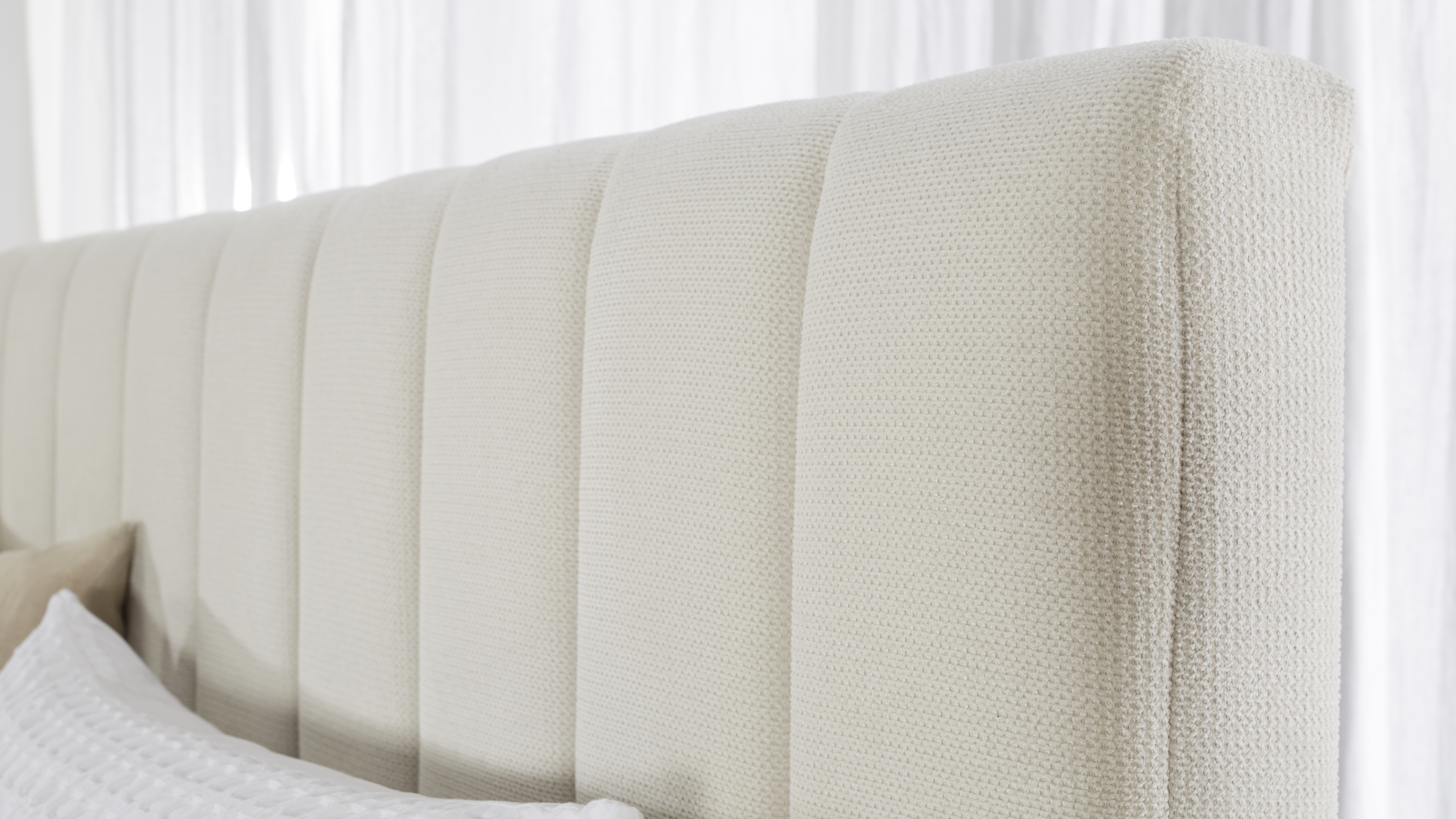 The Ellie Upholstered Bed Frame creates a luxurious retreat with art deco styling. Featuring plush weave fabric, tuck & roll upholstery and a timber plinth surround. The neutral tone will elevate any bedroom décor.