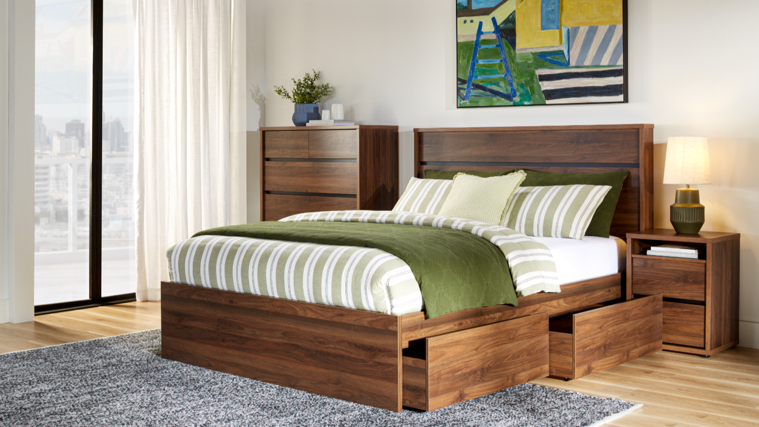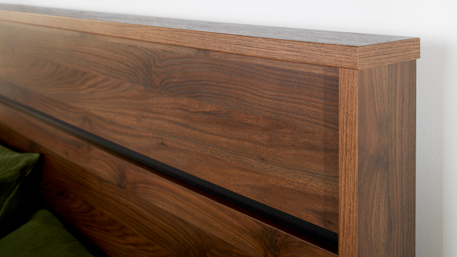 Design a sleek and contemporary bedroom range for the family to enjoy. Featuring a rich walnut woodgrain finish with contrasting black rails. Proudly New Zealand made. Exclusive to Harvey Norman.