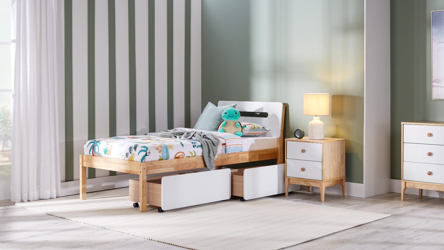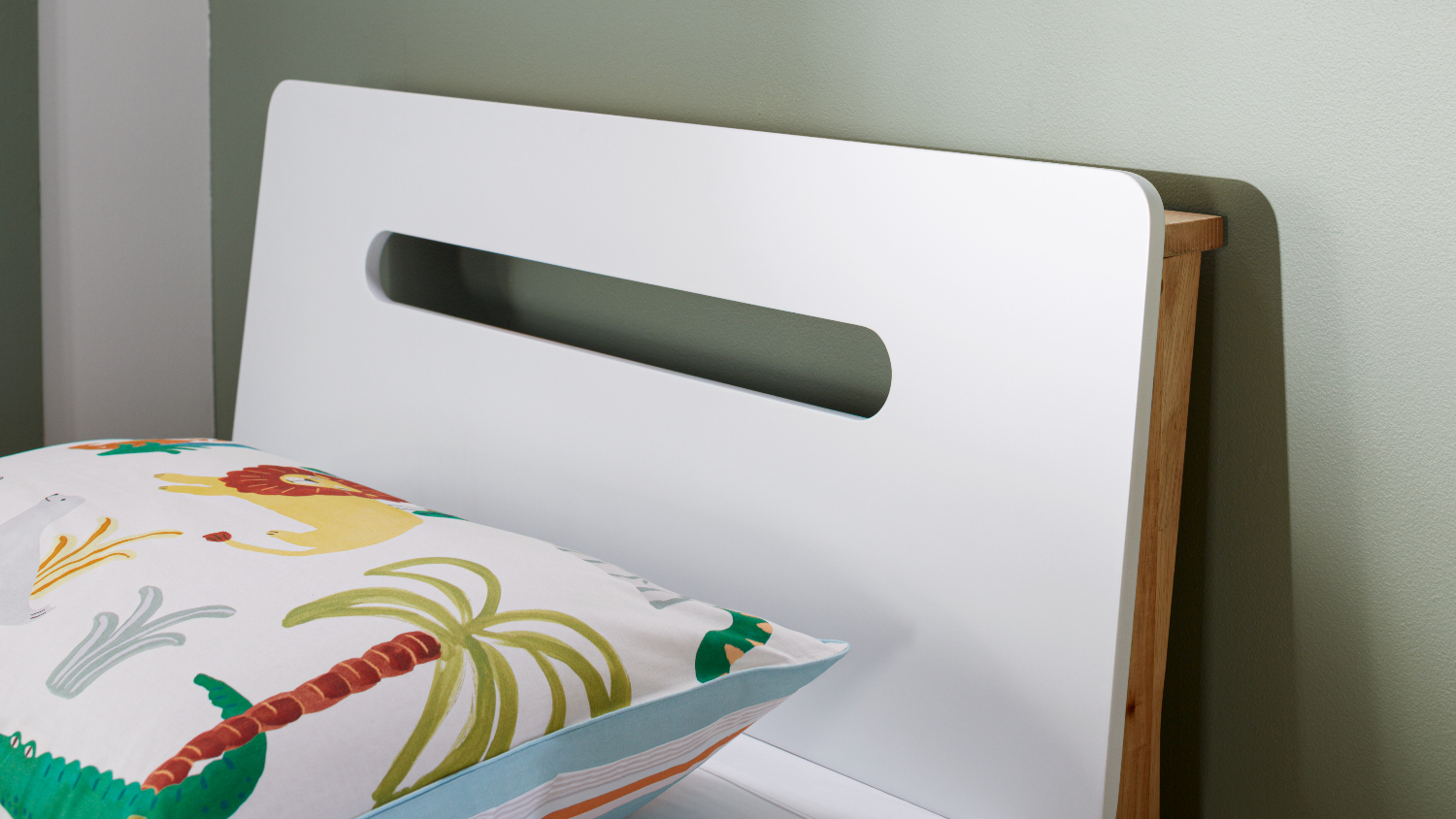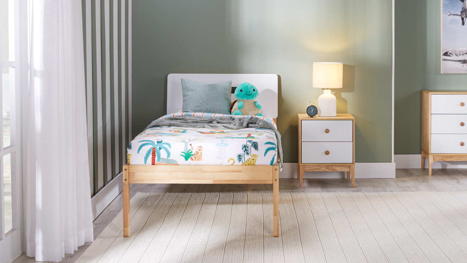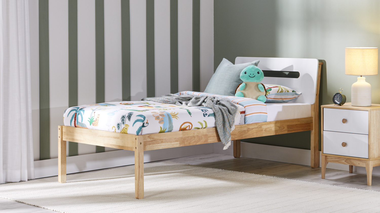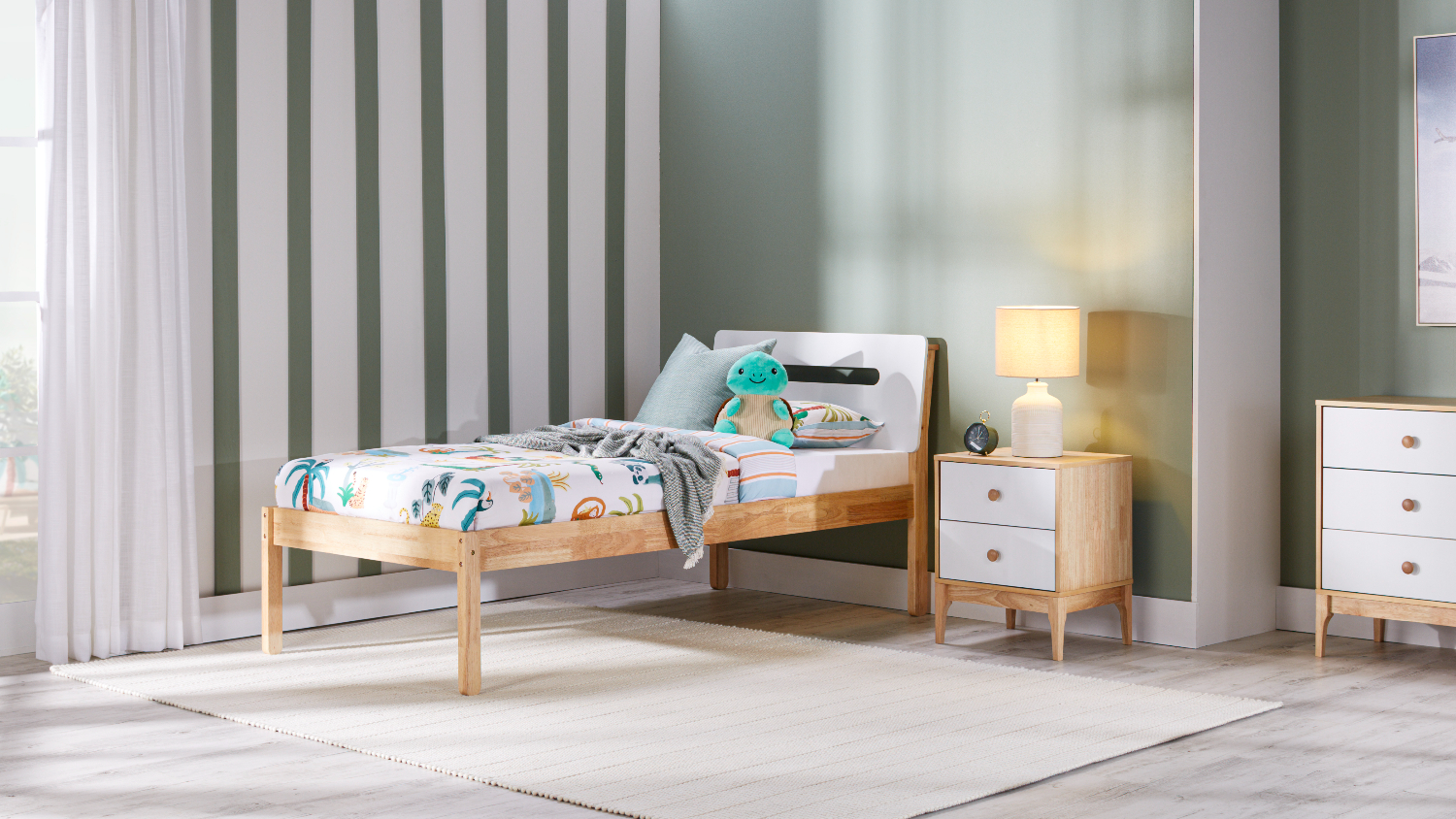 The Jesse King Single Bed Frame brings a clean, contemporary look to any bedroom with its simple white headboard and natural timber base. Crafted for durability, it offers sturdy support while maintaining a light, modern aesthetic. Its versatile design makes it easy to pair with a wide range of bedding styles.