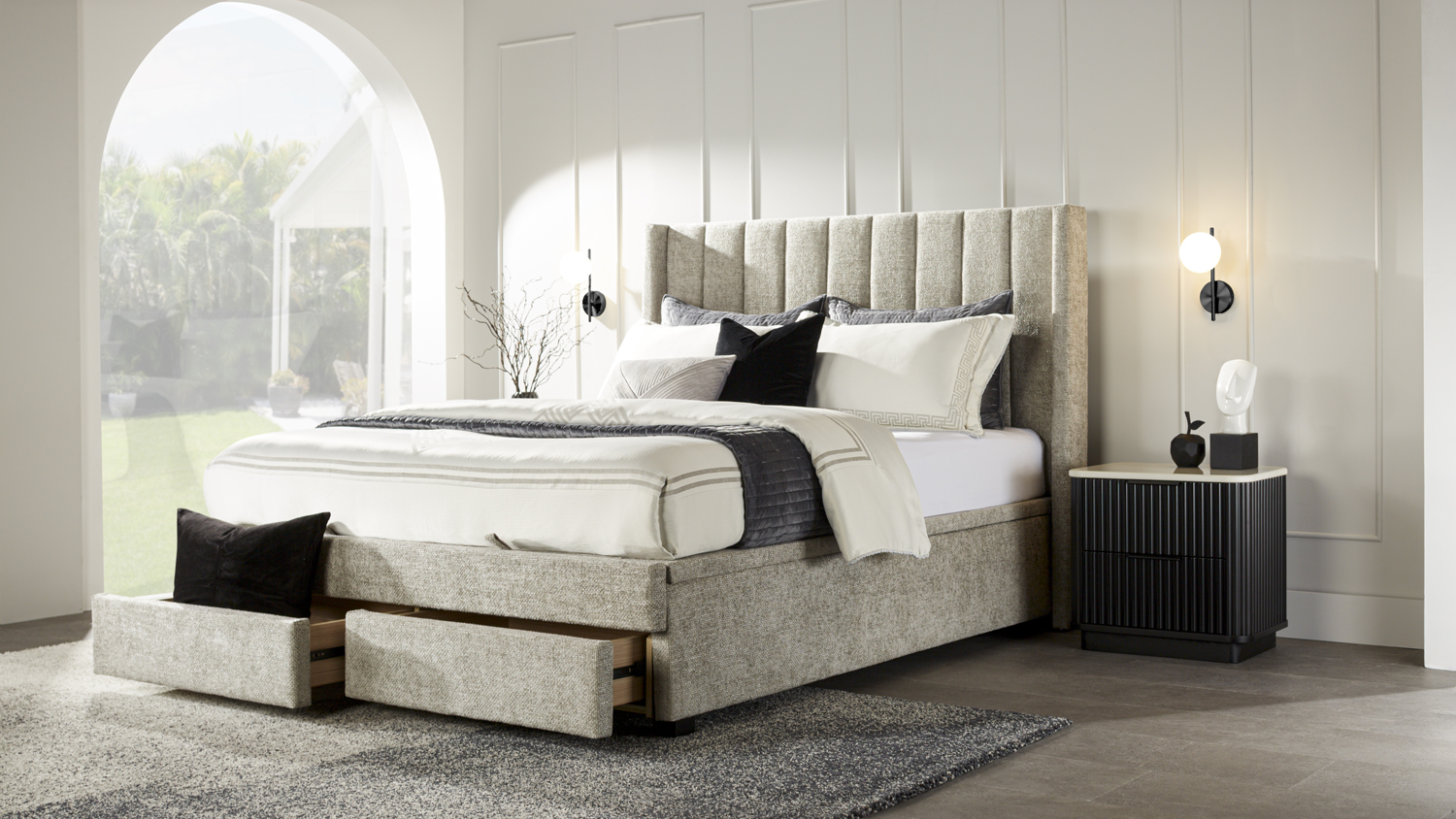 Presenting the Orbit King Upholstered Gas Lift Storage Bed Frame with 2 Drawer Base. Featuring a neutral grey, padded upholstered headboard for the perfect combination of comfort and style. The plush channeled headboard design with wings make it a stunning statement piece. This bed frame features a gas lift mechanism as well as 2 under-bed storage drawers, allowing the whole base to be used as storage for spare blankets and anything else you'd like conveniently hidden away.