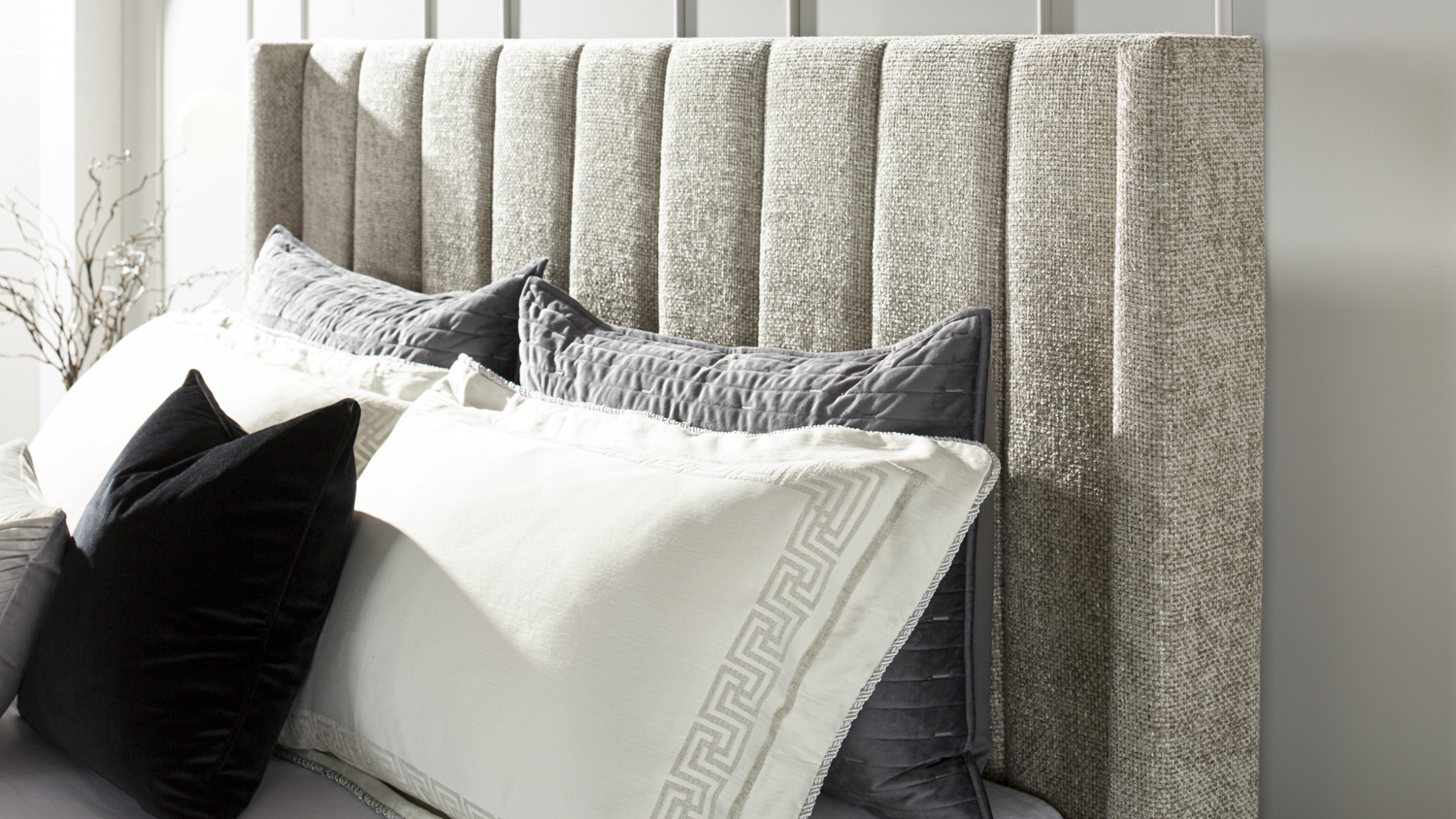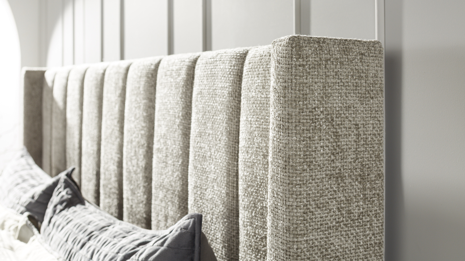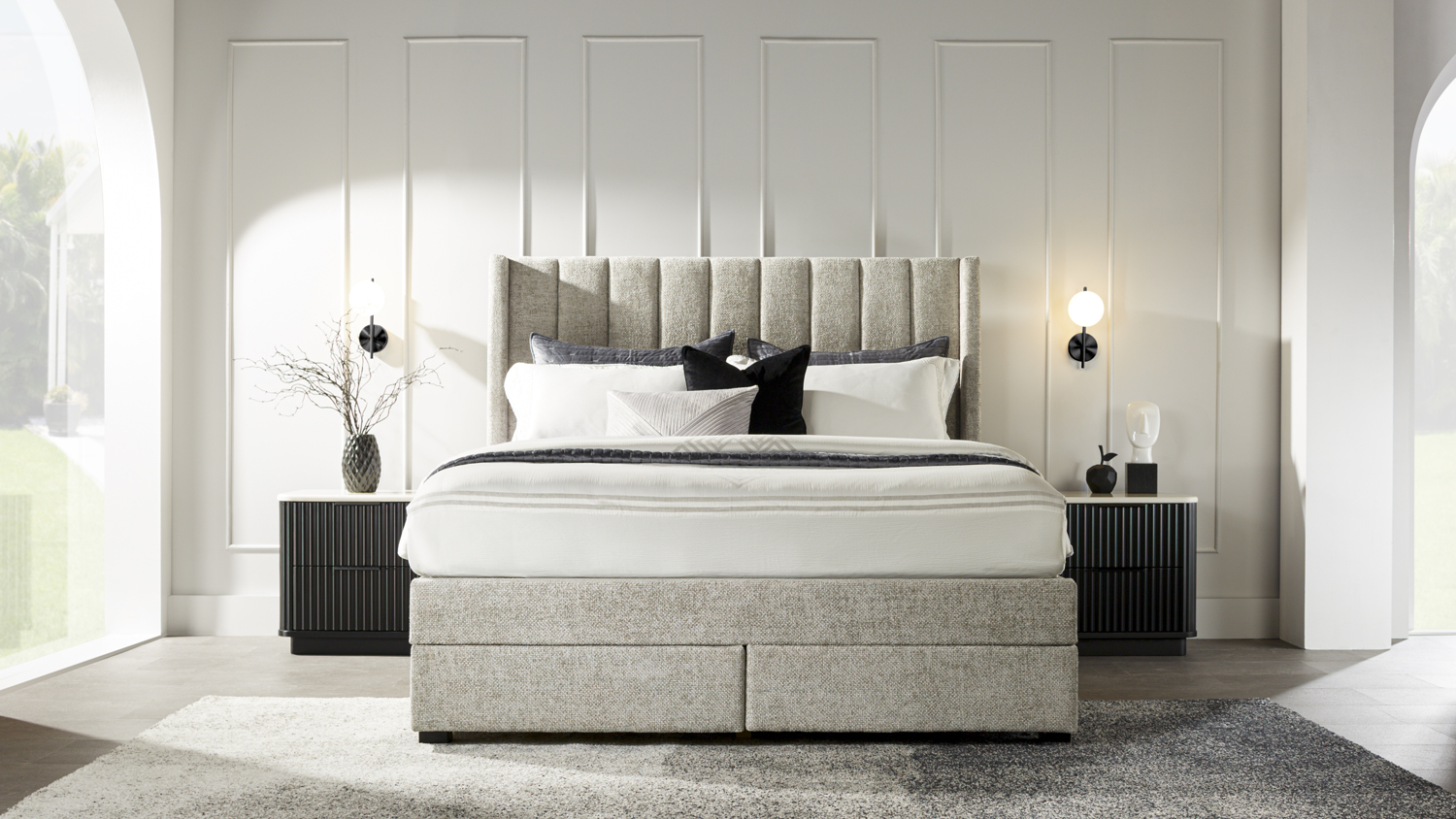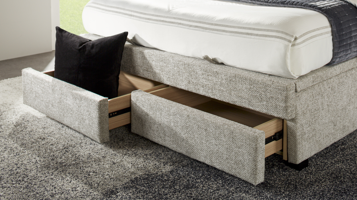 Presenting the Orbit Upholstered Gas Lift Bed Frame with 2 Drawer Base. Featuring a neutral grey, padded upholstered headboard for the perfect combination of comfort and style. The plush channeled headboard design with wings make it a stunning statement piece. This bed frame features a gas lift mechanism as well as 2 under-bed storage drawers, allowing the whole base to be used as storage for spare blankets and anything else you'd like conveniently hidden away.