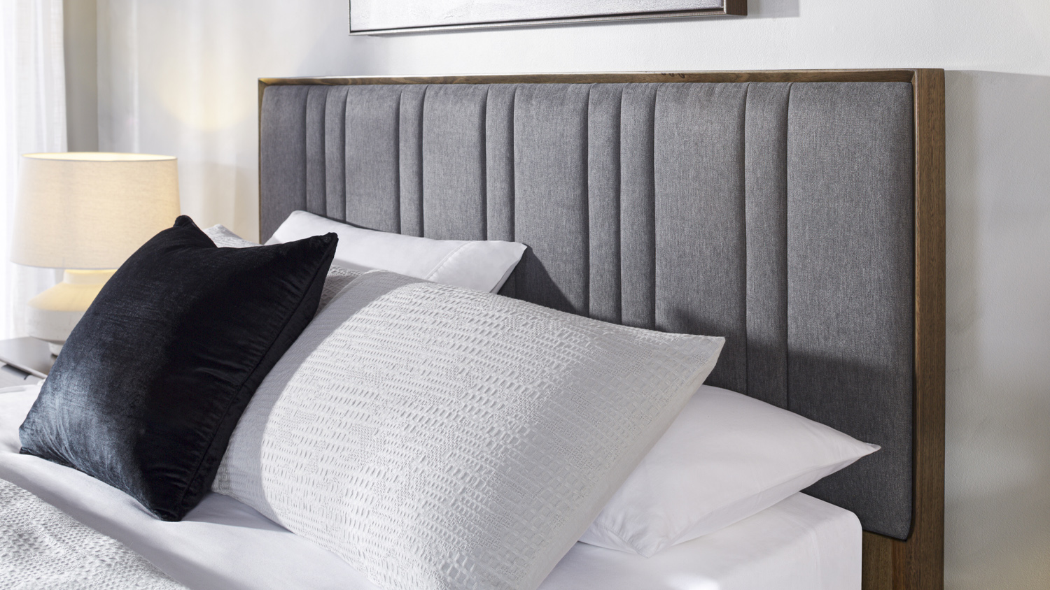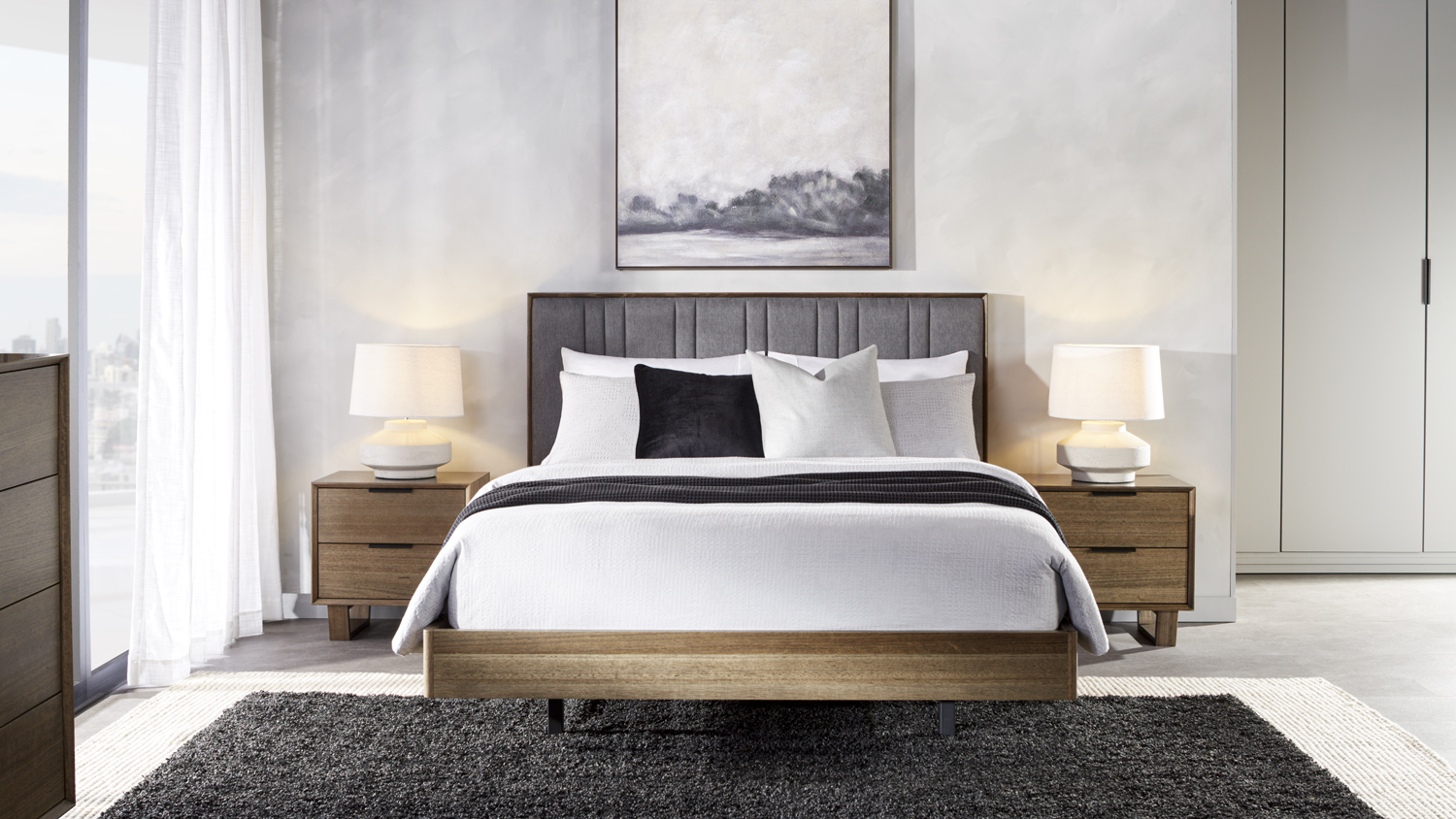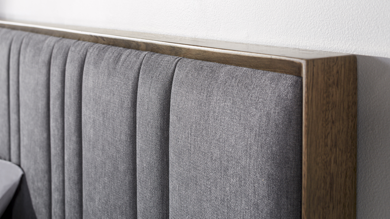 Presenting Whitehaven King Upholstered Bed Frame, featuring a modern upholstered panel stitch headboard with Tassie Oak solid legs and frame.
