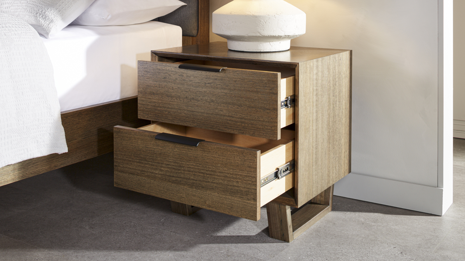 The Whitehaven 2 Drawer Bedside Table blends the soft warmth of Tassie Oak veneer with clean, modern lines for a timeless look. Its two roomy felt lined drawers offer practical bedside storage with recessed handles paired with sturdy, block-style legs.