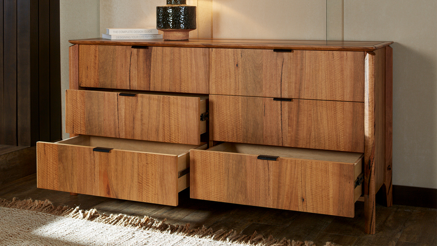 Presenting the Cory 6 Drawer Lowboy. Constructed from beautiful Marri timber with unique natural grain variations and honey hues for a soft yet refined look. Featuring 6 drawers with ample storage space for all your bedroom necessities. With it's rounded legs with cutaway detailing and modern black handles, Cory is sure to elevate your bedroom.