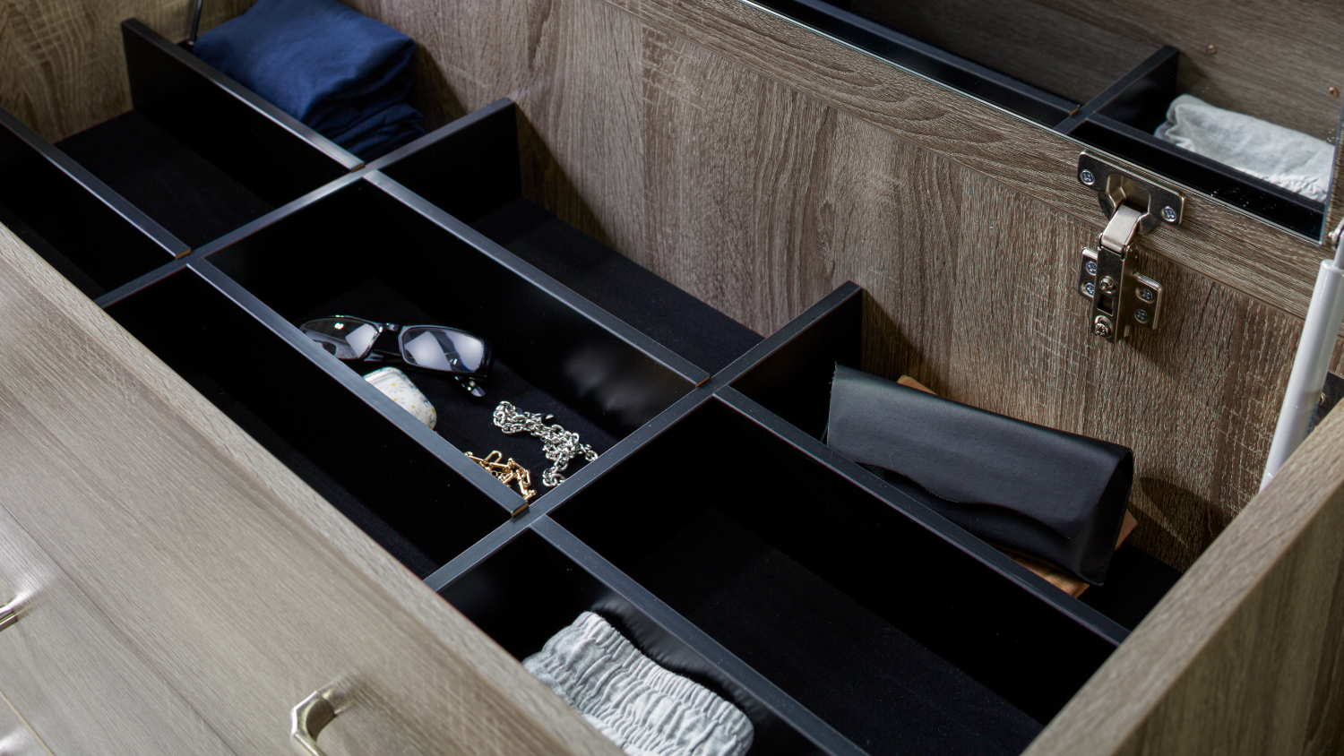 The Edge 5 Drawer Tallboy with Lift Top will add a contemporary touch to your bedroom. Featuring a classic, sleek design and four generous functional drawers to keep a clutter-free space. There is additional storage in place of the top drawer that has been cleverly crafted with a flip-up mirror and segmented storage space for jewellery and other essentials. The clean lines of the Edge will give a modern, stylish look to your space.
