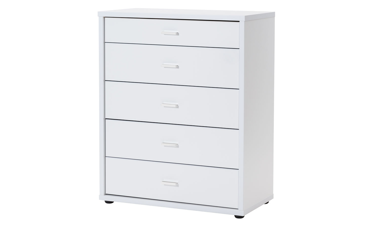 The Hero 5 Drawer Chest is a great chest of drawers that adds style to any bedroom. This chest is available in two contemporary options - fresh white or white with a natural European Oak finish, offering a contemporary cool look that would suit a kids' bedroom perfectly. The sleek finish is matched by smart design - slimline metal bar handles for easy opening, a small glide foot to make transportation and cleaning easier, plus all drawers run on full-extension metal runners for simple care and durability.