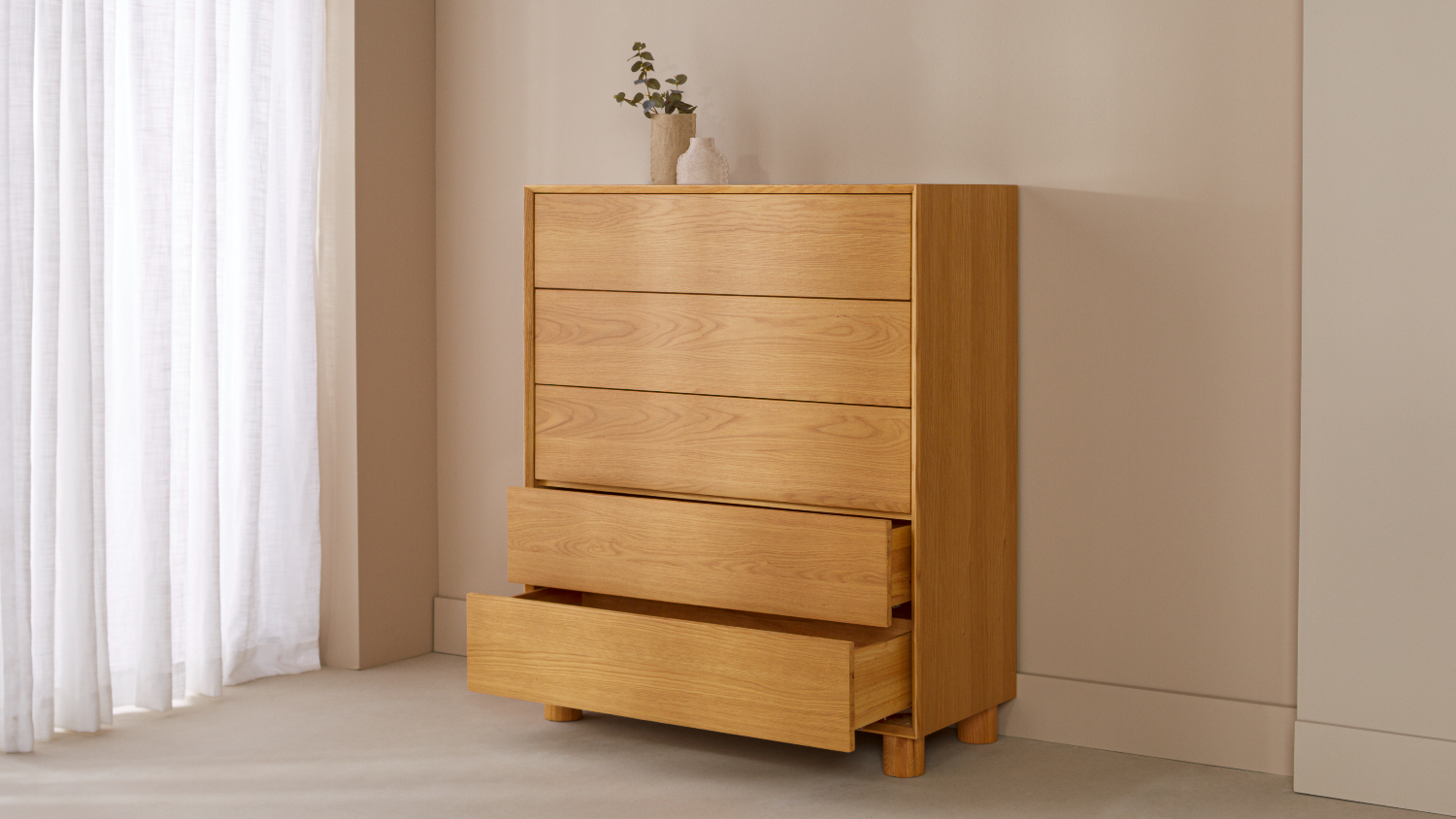 The Jasper 5 Drawer Tallboy offers generous vertical storage, featuring a refined timber finish that brings warmth and character to your bedroom. Its spacious drawers are designed to neatly organise clothing and everyday essentials. With push‑to‑open functionality, the drawers provide a sleek, handle‑free appearance while ensuring effortless, modern usability.