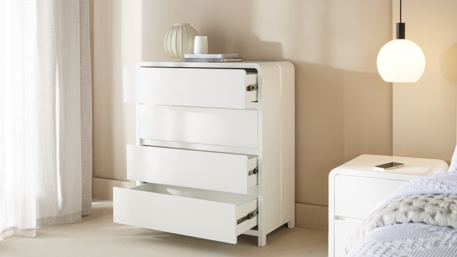 The Lumen 4 Drawer Tallboy combines generous storage capacity with a sleek white finish that brings a fresh, contemporary feel to any bedroom. Its spacious drawers are designed to help organise clothing and essentials with ease. Equipped with soft‑close runners, each drawer glides smoothly and quietly for a premium everyday experience.