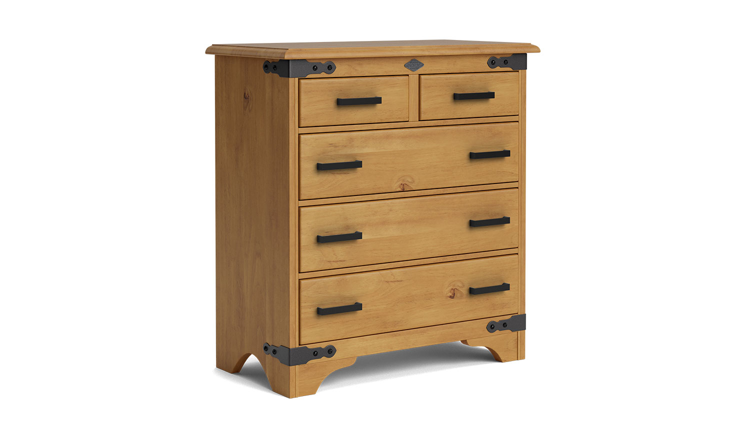 The Nordic 5 Drawer Lowboy comprises solid pine timber with a bevelled edge and forged iron trim, resulting in a timeless look that harmonises with traditional interiors. With five dovetailed drawers, you instantly gain versatile and attractive storage. From the initial design, right through to the unique, hand rubbed polishing process, this chest of drawers has been crafted to bring enduring quality and style to your home.