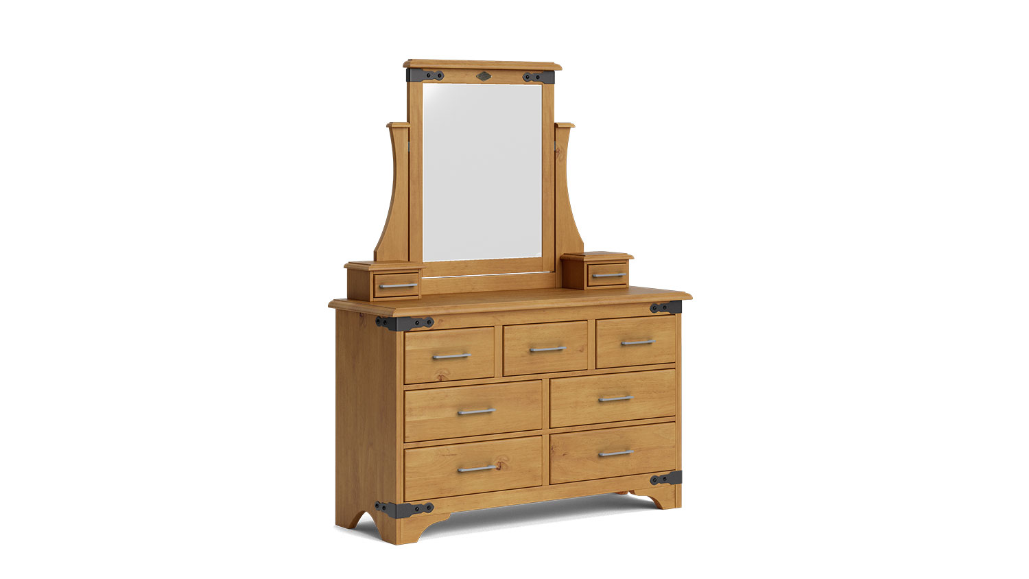The Nordic 9 Drawer Dresser and Mirror comprises solid pine timber with a bevelled edge and forged iron trim, resulting in a timeless look that harmonises with traditional interiors. With seven large dovetailed drawers and two trinket drawers, you instantly gain versatile and attractive storage. From the initial design, right through to the unique, hand rubbed polishing process, this dresser has been crafted to bring enduring quality and style to your home.