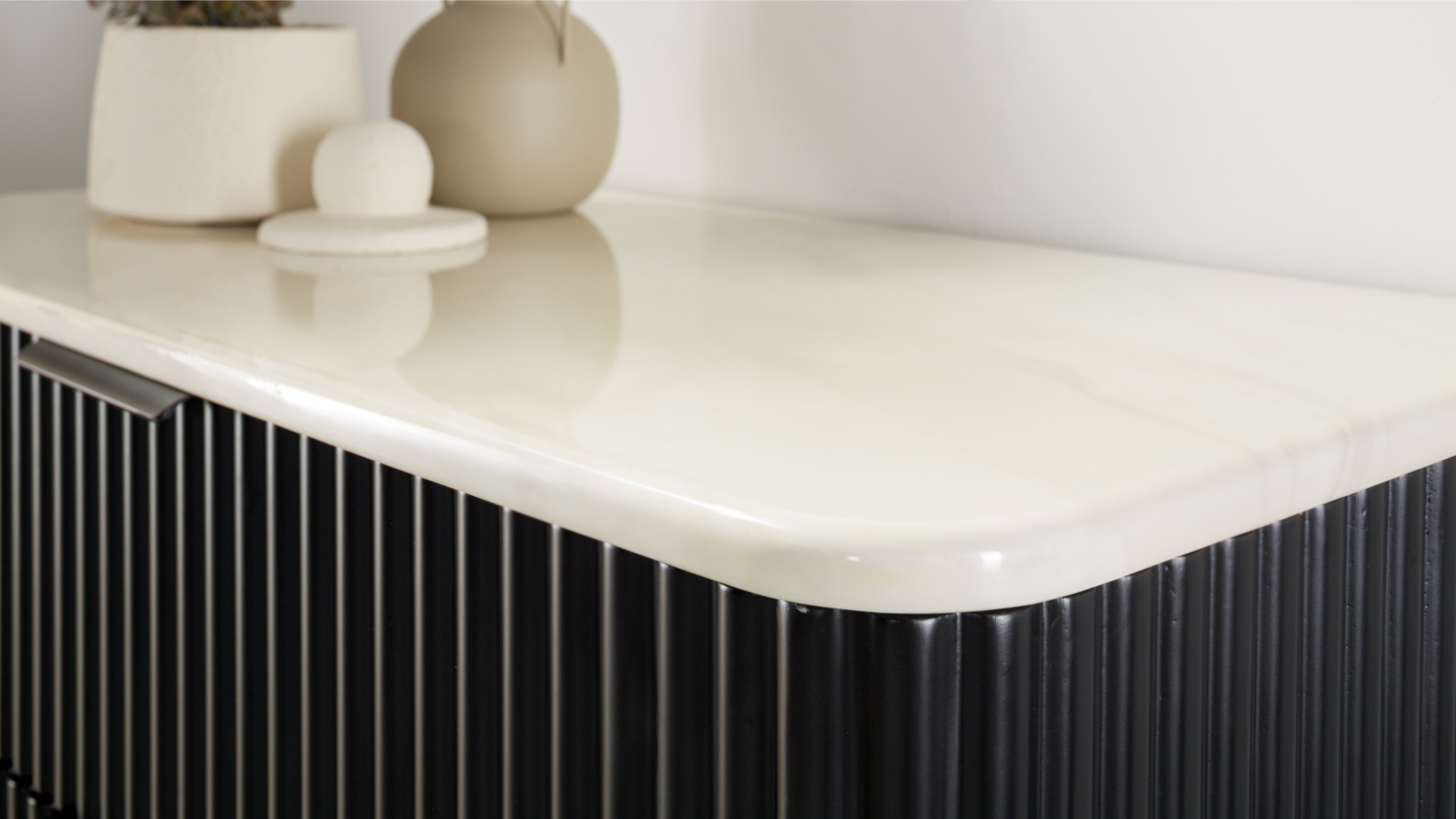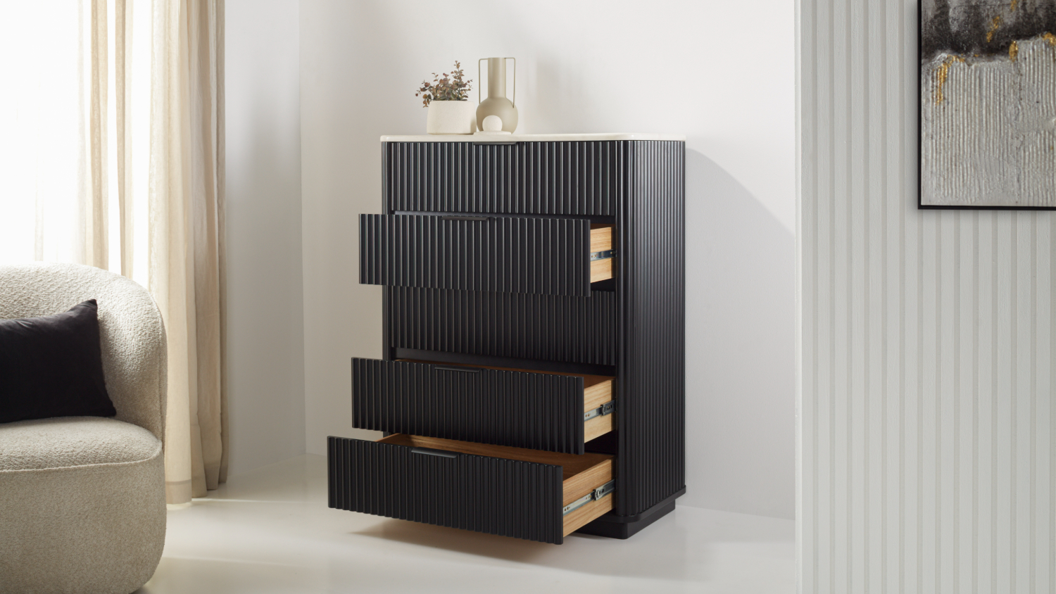 Presenting the Province 5 Drawer Tallboy. The Province collection blends functionality and contemporary design with a bold monochrome look. Featuring fluted black detailing complemented by a marble-look finished top, Province creates a statement in any bedroom. Five drawers provide ample storage to keep your space clutter-free. The marble-look top is coated with polyurethane resin, offering a sleek, waterproof surface that resists scratches and wear.