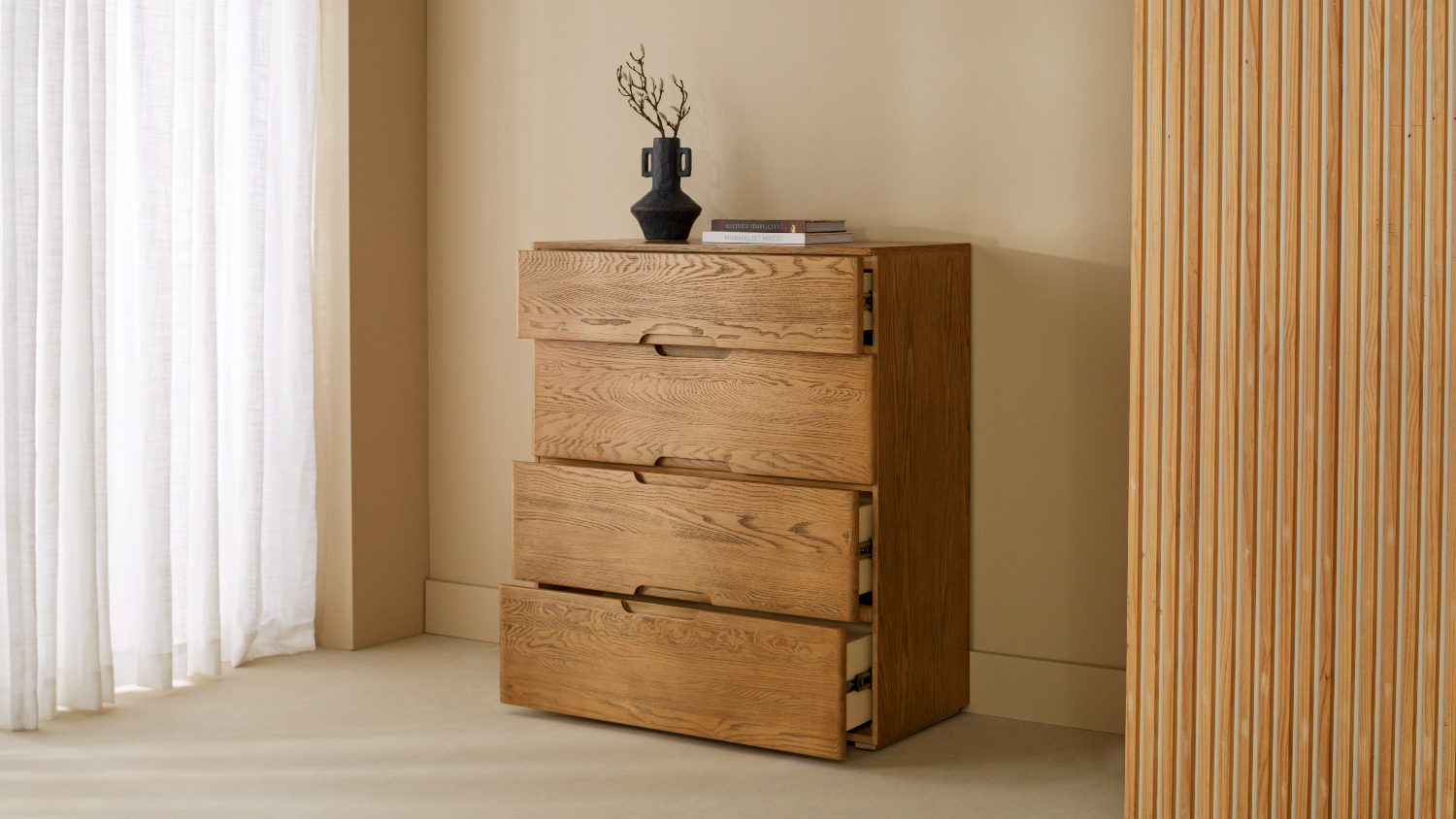 The Resonance 4 Drawer Tallboy features a refined white‑ash timber finish and four spacious drawers, offering stylish and functional bedroom storage. Its generous drawer capacity helps keep clothing and everyday essentials neatly organised. Each drawer is fitted with soft‑close runners, ensuring smooth, quiet operation.