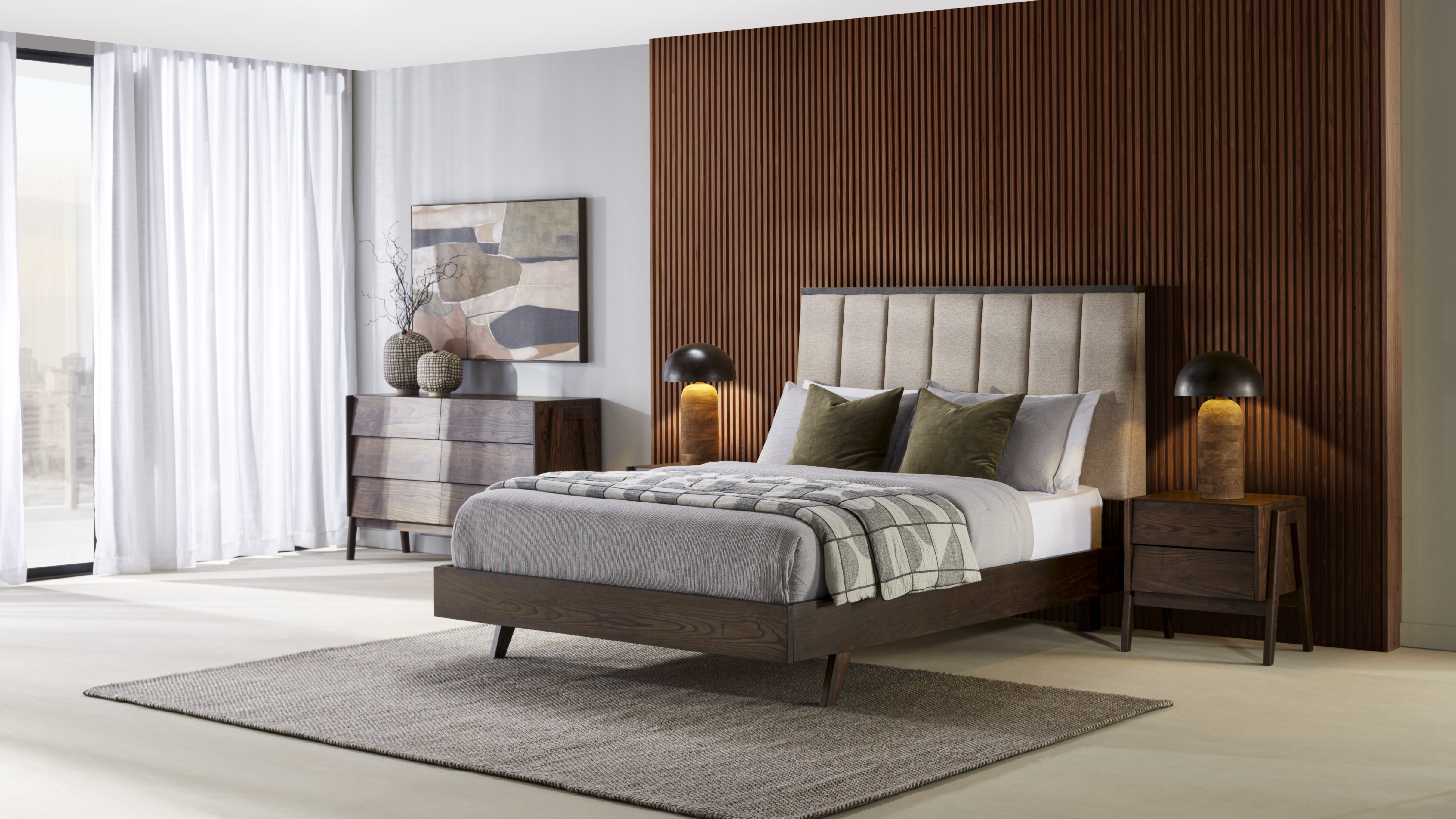 The Alexa Queen Headboard features a tall, upholstered design with vertical panel detailing for a structured, modern look. Finished in a neutral fabric, it provides a clean backdrop that pairs easily with a variety of bedroom settings and furniture styles.