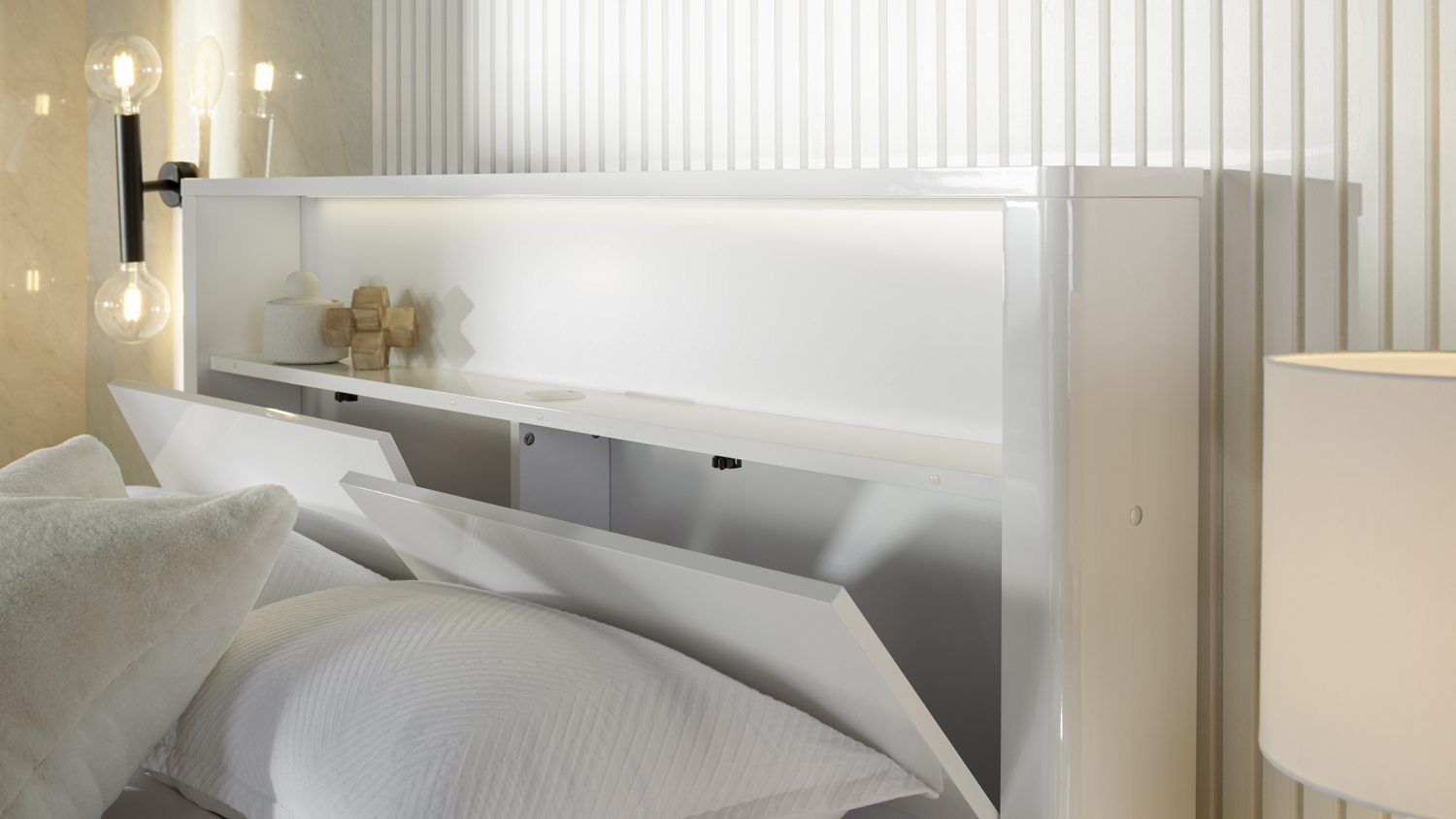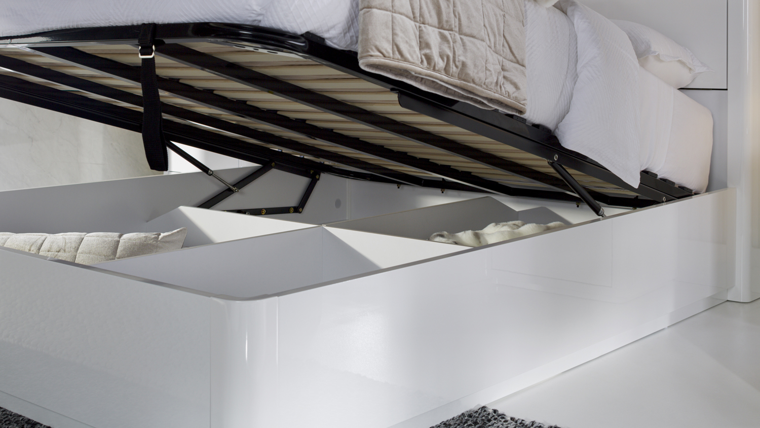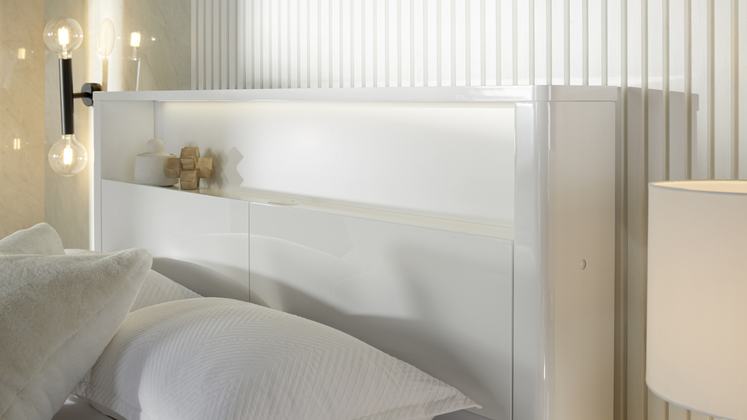 Presenting the Adanya Gas Lift Storage Bed Frame . With modern lines and smooth curves in high gloss white, Adanya is the perfect addition to any contemporary décor. Featuring gas lift under bed storage, you'll have plenty of space to store extra blankets, clothes or anything else you want hidden from view. The bedhead boasts extra storage with two storage panels and a shelf. The shelf features LED Lights to create an ambient backdrop, and has inbuilt USB and wireless charging ports for convenient charging.