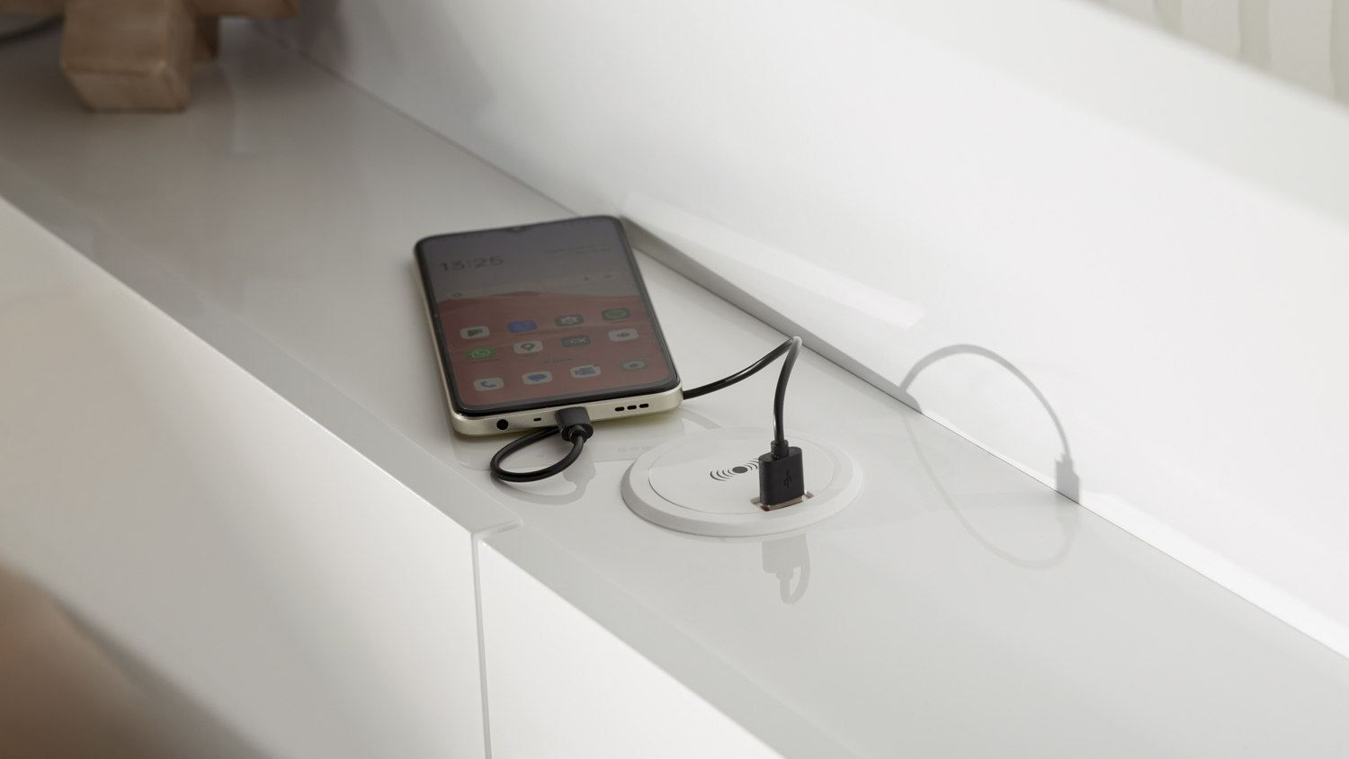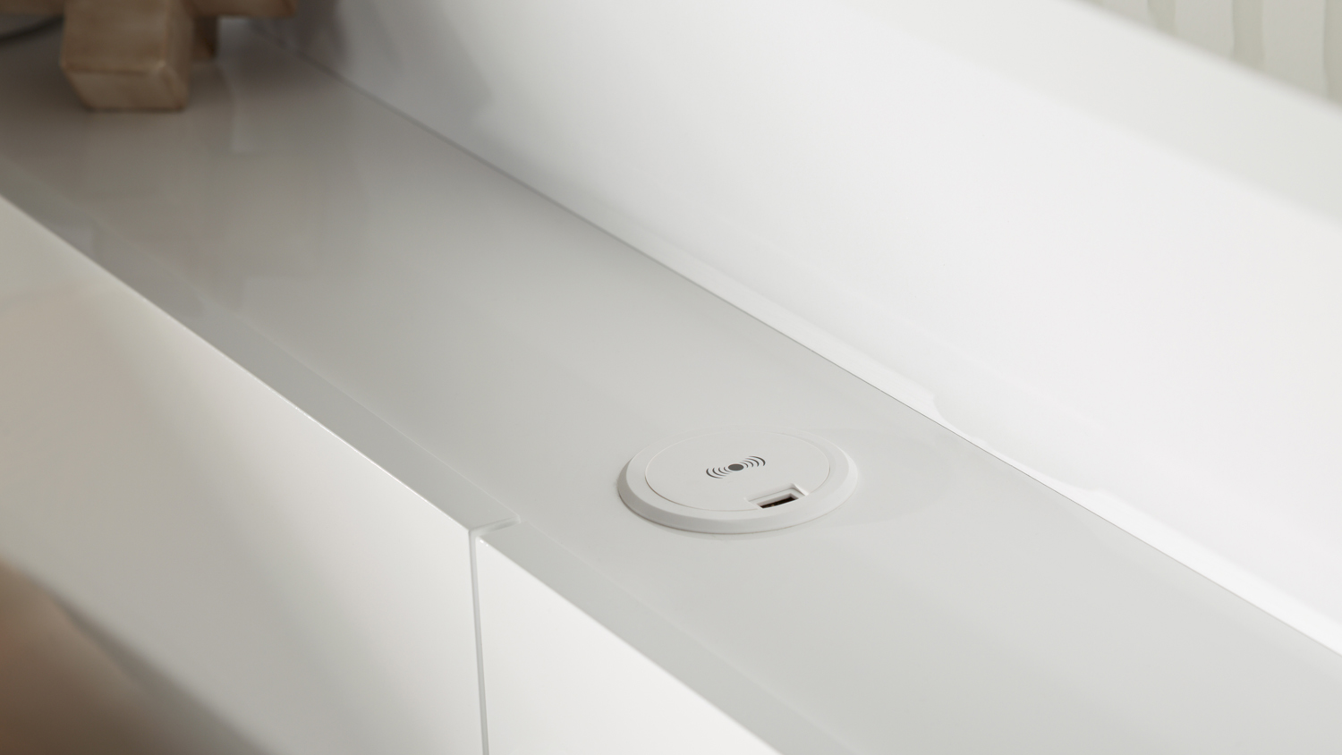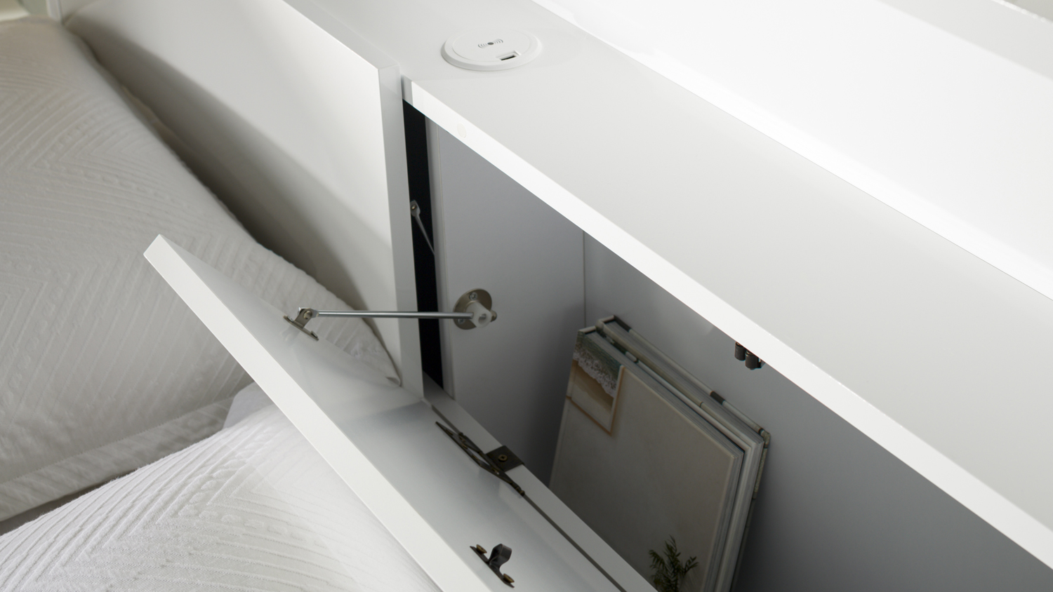 Presenting the Adanya Gas Lift Storage Bed Frame . With modern lines and smooth curves in high gloss white, Adanya is the perfect addition to any contemporary décor. Featuring gas lift under bed storage, you'll have plenty of space to store extra blankets, clothes or anything else you want hidden from view. The bedhead boasts extra storage with two storage panels and a shelf. The shelf features LED Lights to create an ambient backdrop, and has inbuilt USB and wireless charging ports for convenient charging.