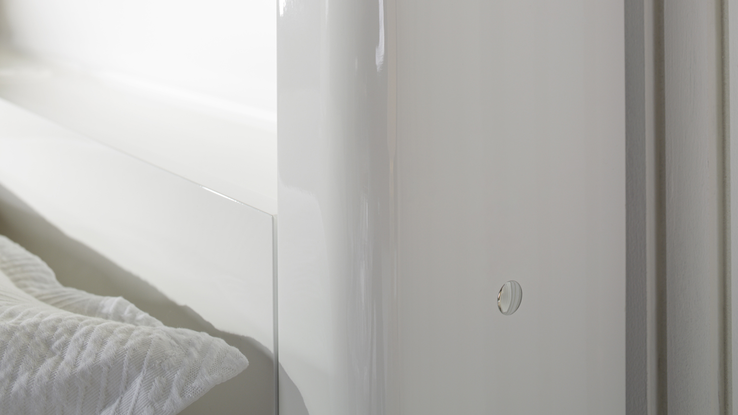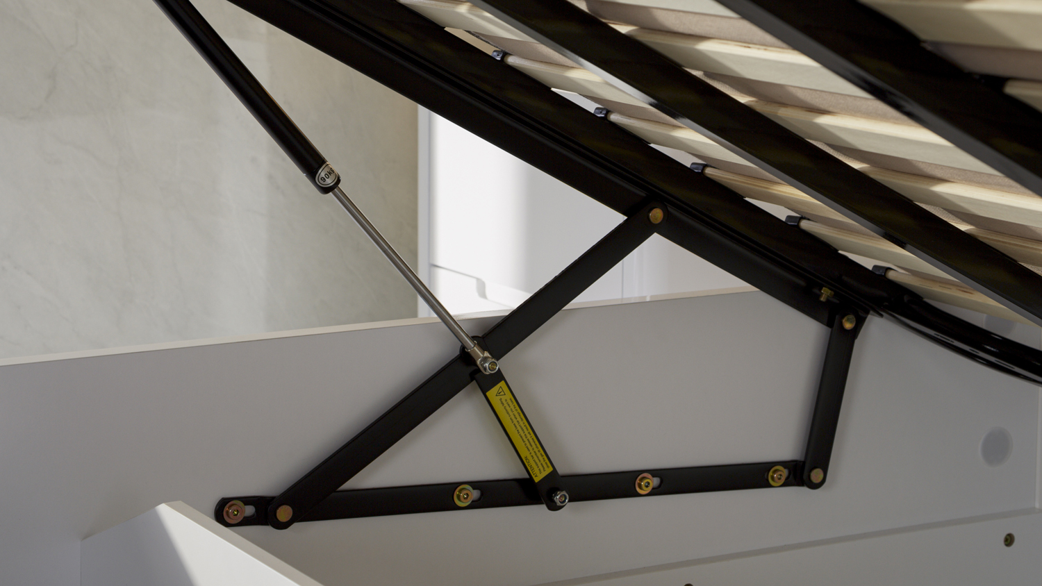 Materials: High Gloss White Polyurethane Paint over MDF Substrate, LVL Bedslats in Metal Gas Lift Frame.
