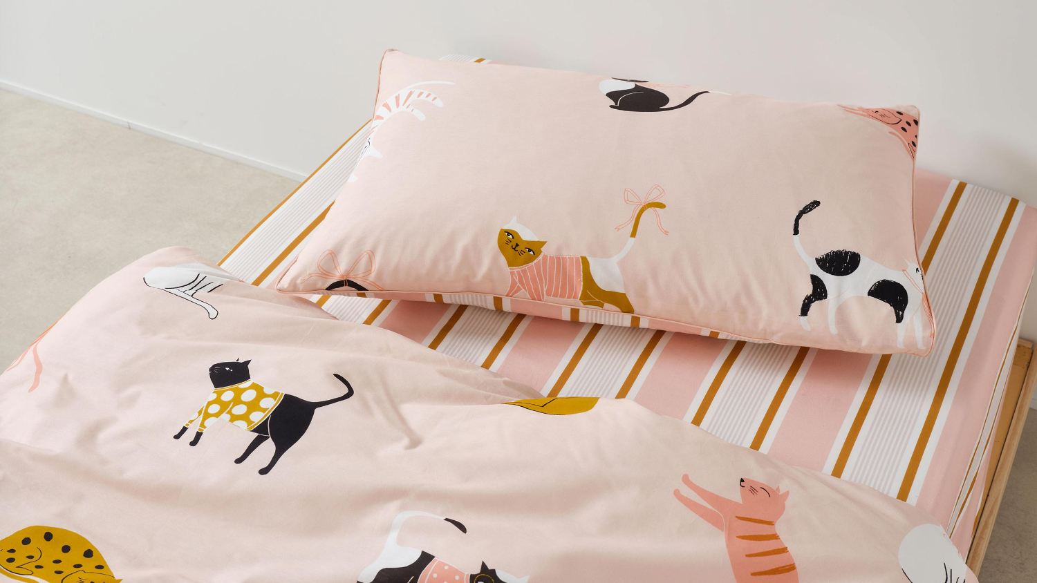 These fashionable felines love to accessorise, and know what’s on-trend. Illustrated by hand in our design studio and printed on cotton percale in contemporary palette, these super-chic cats are overflowing with personality, and cheeky feline fun! What's more, Cats 'n' Bows reverses to a striped design for another aesthetic, is finished with cord piping, and looks marvelous styled with our Sailor Stripe sheet set, themed novelty cushions, and accessories.